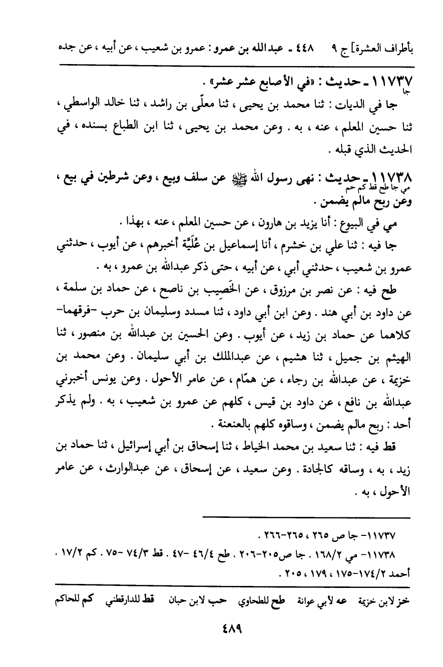 11738 - حَدِيثٌ (مي جا طح قط كم حم) : نَهَى رَسُولُ اللَّهِ، صَلَّى اللَّهُ عَلَيْهِ وَسَلَّمَ، عَنْ سَلَفٍ وَبَيْعٍ، وَعَنْ شَرْطَيْنِ فِي بَيْعٍ، وَعَنْ رِبْحِ مَا لَمْ يُضْمَنْ. مي فِي الْبُيُوعِ: أَنَا يَزِيدُ بْنُ هَارُونَ، عَنْ حُسَيْنٍ الْمُعَلَّمِ، عَنْهُ، بِهَذَا. جا فِيهِ: ثنا عَلِيُّ بْنَ خَشْرَمٍ، أَنَا إِسْمَاعِيلُ ابْنُ عُلَيَّةَ أَخْبَرَهُمْ، عَنْ أَيُّوبَ، حَدَّثَنِي عَمْرُو بْنُ شُعَيْبٍ، حَدَّثَنِي أَبِي، عَنْ أَبِيهِ، حَتَّى ذَكَرَ عَبْدَ اللَّهِ بْنَ عَمْرٍو، بِهِ. طح فِيهِ: عَنْ نَصْرِ بْنِ مَرْزُوقٍ، عَنِ الْخَصِيبِ بْنِ نَاصِحٍ، عَنْ حَمَّادِ بْنِ سَلَمَةَ، عَنْ دَاوُدَ بْنِ أَبِي هِنْدٍ. وَعَنِ ابْنِ أَبِي دَاوُدَ، ثنا مُسَدَّدٌ، وَسُلَيْمَانُ بْنُ حَرْبٍ، فَرَّقَهُمَا، كِلاهُمَا عَنْ حَمَّادِ بْنِ زَيْدٍ، عَنْ أَيُّوبَ. وَعَنِ الْحُسَيْنِ بْنِ عَبْدِ اللَّهِ بْنِ مَنْصُورٍ، ثنا الْهَيْثَمُ بْنُ جَمِيلٍ، ثنا هُشَيْمٌ، عَنْ عَبْدِ الْمَلِكِ بْنِ أَبِي سُلَيْمَانَ. وَعَنْ مُحَمَّدِ بْنِ خُزَيْمَةَ، عَنْ عَبْدِ اللَّهِ بْنِ رَجَاءٍ، عَنْ هَمَّامٍ، عَنْ عَامِرٍ الأَحْوَلِ. وَعَنْ يُونُسَ، أَخْبَرَنِي عَبْدُ اللَّهِ بْنُ نَافِعٍ، عَنْ دَاوُدَ بْنِ قَيْسٍ، كُلُّهُمْ عَنْ عَمْرِو بْنِ شُعَيْبٍ، بِهِ. وَلَمْ يَذْكُرْ أَحَدٌ: رِبْحِ مَا لَمْ يُضْمَنْ، وَسَاقُوهُ كُلُّهُمْ بِالْعَنْعَنَةِ. قط فِيهِ: ثنا سَعِيدُ بْنُ مُحَمَّدٍ الْخَيَّاطُ، ثنا إِسْحَاقُ بْنُ أَبِي إِسْرَائِيلَ، ثنا حَمَّادُ بْنُ زَيْدٍ، بِهِ. وَسَاقَهُ كَالْجَادَّةِ. وَعَنْ سَعِيدٍ، عَنْ إِسْحَاقَ، عَنْ عَبْدِ الْوَارِثِ، عَنْ عَامِرٍ الأَحْوَلِ، بِهِ.