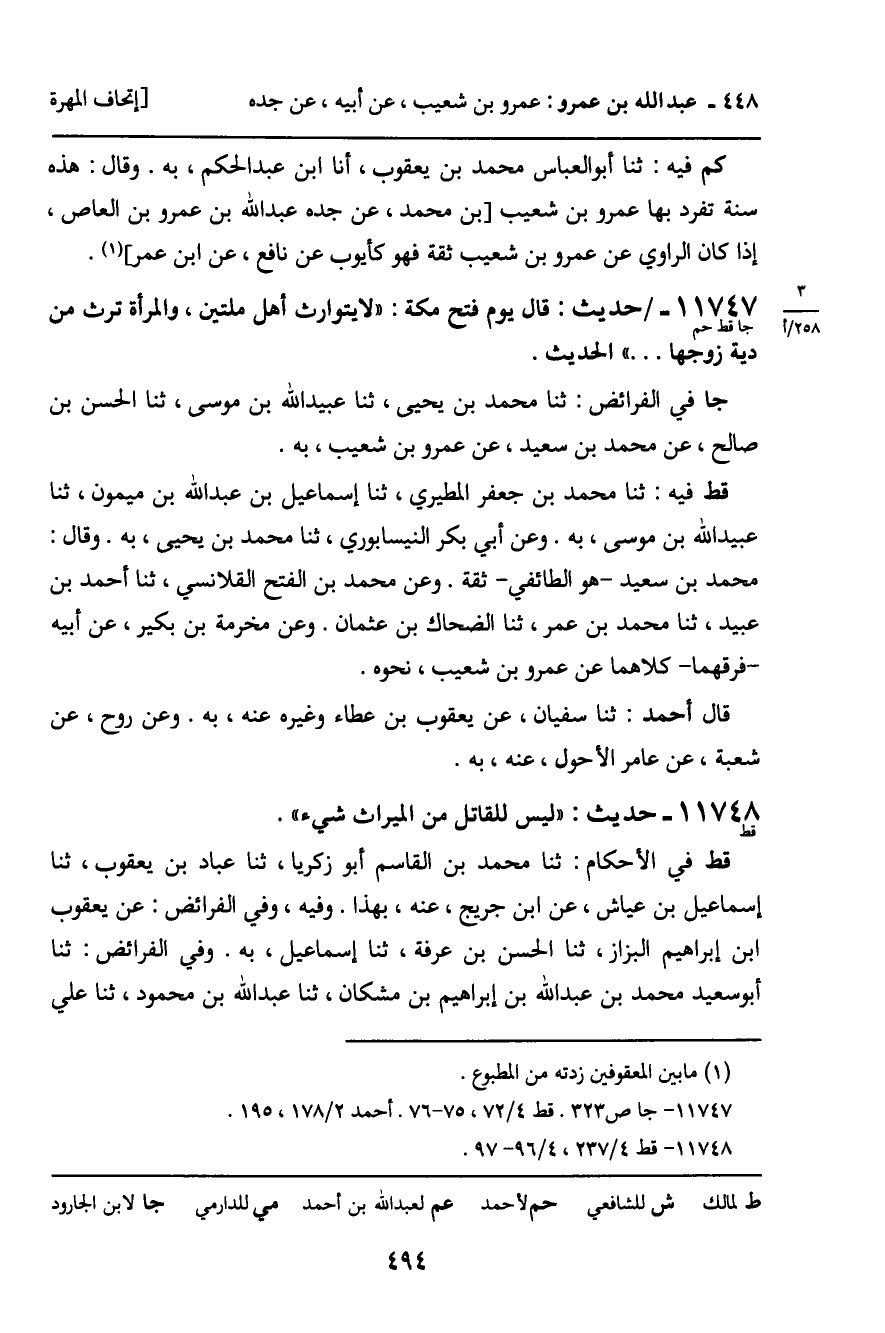 11747 - حَدِيثٌ (جا قط حم) : قَالَ يَوْمَ فَتْحِ مَكَّةَ: " لا يَتَوَارَثُ أَهْلُ مِلَّتْيِن، وَالْمَرْأَةُ تَرِثُ مِنْ دِيَةِ زَوْجِهَا ... " الْحَدِيثَ. جا فِي الْفَرَائِضِ: ثنا مُحَمَّدُ بْنُ يَحْيَى، ثنا عُبَيْدُ اللَّهِ بْنُ مُوسَى، ثنا الْحَسَنُ بْنُ صَالِحٍ، عَنْ مُحَمَّدِ بْنِ سَعِيدٍ، عَنْ عَمْرِو بْنِ شُعَيْبٍ، بِهِ. قط فِيهِ: ثنا مُحَمَّدُ بْنُ جَعْفَرٍ الْمَطِيرِيُّ، ثنا إِسْمَاعِيلُ بْنُ عَبْدِ اللَّهِ بْنِ مَيْمُونٍ، ثنا عُبَيْدُ اللَّهِ بْنُ مُوسَى، بِهِ. وَعَنْ أَبِي بَكْرٍ النَّيْسَابُورِيِّ، ثَنا مُحَمَّدُ بْنُ يَحْيَى، بِهِ. وَقَالَ: مُحَمَّدُ بْنُ سَعِيدٍ، هُوَ الطَّائِفِيُّ، ثِقَةٌ. وَعَنْ مُحَمَّدِ بْنِ الْفَتْحِ الْقَلانِسِيِّ، ثنا أَحْمَدُ بْنُ عُبَيْدٍ، ثنا مُحَمَّدُ بْنُ عُمَرَ، ثنا الضَّحَّاكُ بْنُ عُثْمَانَ. وَعَنْ مَخْرَمَةَ بْنِ بُكَيْرٍ، عَنْ أَبِيهِ، فَرَّقَهُمَا، كِلاهُمَا عَنْ عَمْرِو بْنِ شُعَيْبٍ، نَحْوَهُ. قَالَ أَحْمَدُ: ثنا سُفْيَانُ، عَنْ يَعْقُوبَ بْنِ عَطَاءٍ، وَغَيْرِهِ عَنْهُ، بِهِ. وَعَنْ رَوْحٍ، عَنْ شُعْبَةَ، عَنْ عَامِرٍ الأَحْوَلِ، عَنْهُ، بِهِ.