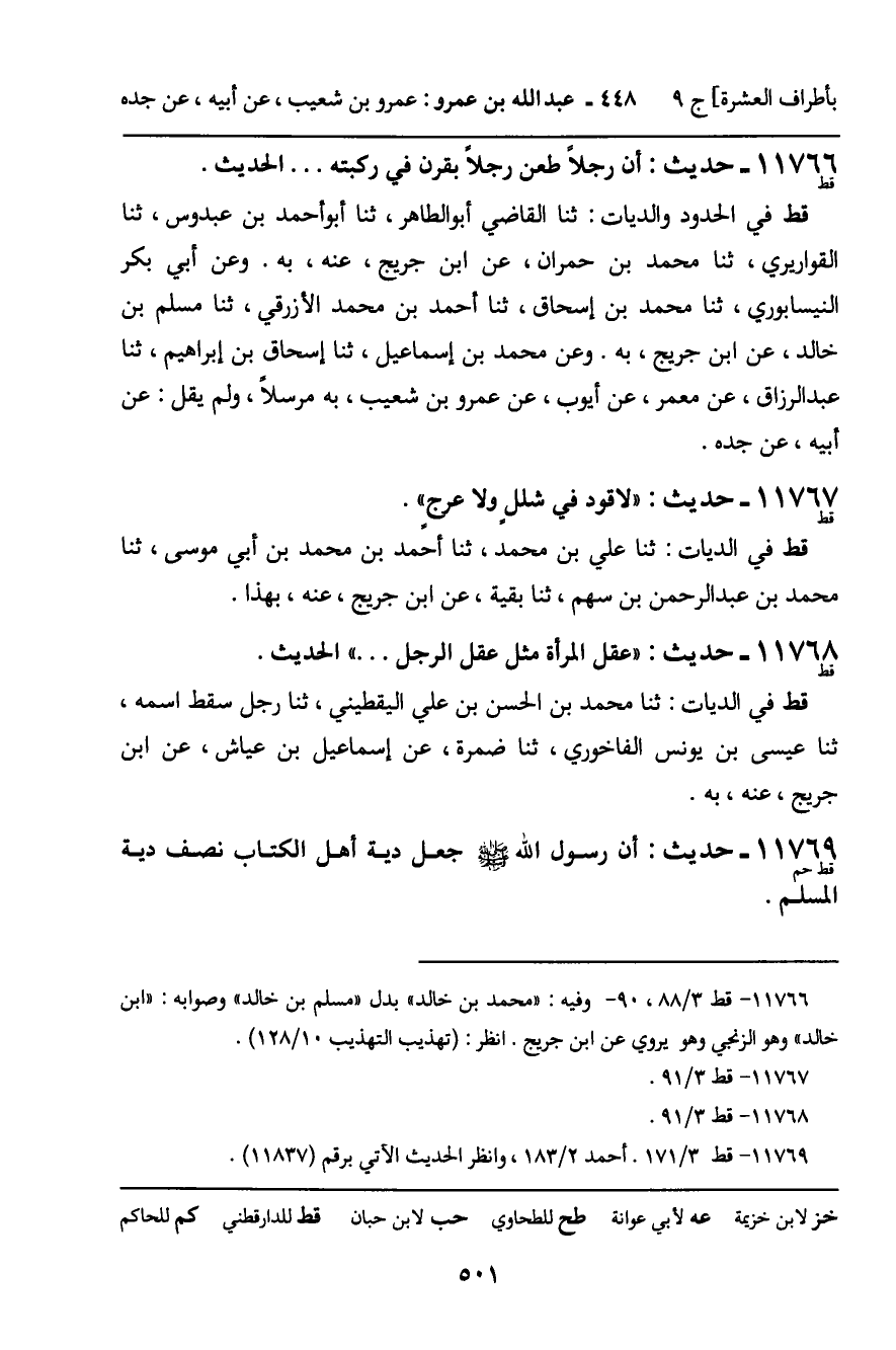 11766 - حَدِيثٌ (قط) : أَنَّ رَجُلا طَعَنَ رَجُلا بِقَرْنٍ فِي رُكْبَتِهِ ... الْحَدِيثَ. قط فِي الْحُدُودِ وَالدِّيَاتِ: ثنا الْقَاضِي أَبُو الطَّاهِرِ، ثنا أَبُو أَحْمَدَ بْنُ عَبْدُوسٍ، ثنا الْقَوَارِيرِيُّ، ثنا مُحَمَّدُ بْنُ حُمْرَانَ، عَنِ ابْنِ جُرَيْجٍ، عَنْهُ، بِهِ. وَعَنْ أَبِي بَكْرٍ النَّيْسَابُورِيِّ، ثنا مُحَمَّدُ بْنُ إِسْحَاقَ، ثنا أَحْمَدُ بْنُ مُحَمَّدٍ الأَزْرَقِيُّ، ثنا مُسْلِمُ بْنُ خَالِدٍ، عَنِ ابْنِ جُرَيْجٍ، بِهِ. وَعَنْ مُحَمَّدِ بْنِ إِسْمَاعِيلَ، ثنا إِسْحَاقُ بْنُ إِبْرَاهِيمَ، ثنا عَبْدُ الرَّزَّاقِ، عَنْ مَعْمَرٍ، عَنْ أَيُّوبَ، عَنْ عَمْرِو بْنِ شُعَيْبٍ، بِهِ مُرْسَلا، وَلَمْ يَقُلْ: عَنْ أَبِيهِ، عَنْ جَدِّهِ.