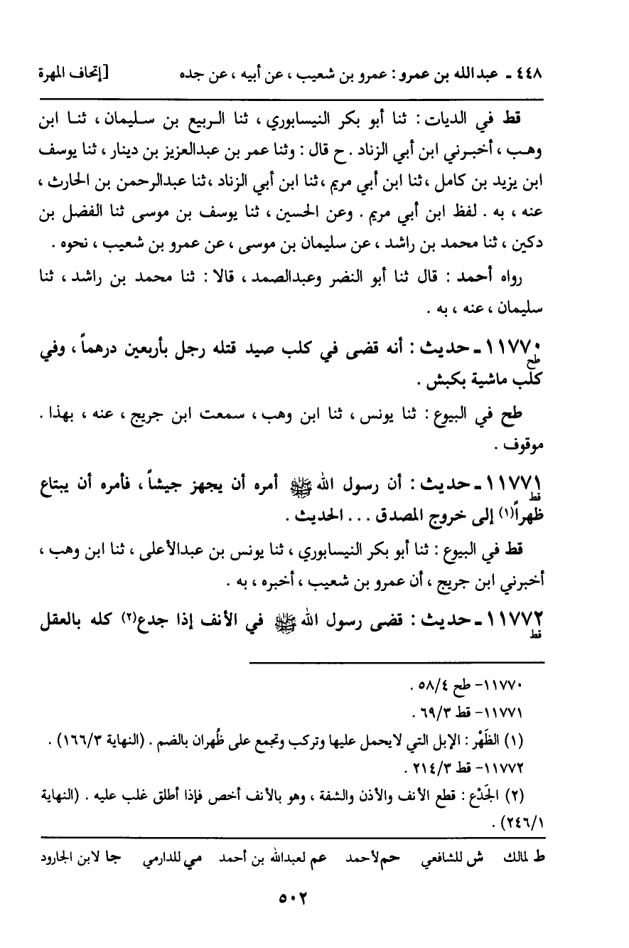 -[503]- كَامِلا، وَإِذَا جُدِعَتْ أَرْنَبَتُهُ فَنِصْفُ الْعَقْلِ. قط فِي الدِّيَاتِ: ثنا الْحُسَيْنُ بْنُ صَفْوَانَ، ثنا عَبْدُ اللَّهِ بْنُ أَحْمَدَ بْنِ حَنْبَلٍ، ثنا أَبِي، ثنا يَعْقُوبُ بْنُ إِبْرَاهِيمَ، ثنا أَبِي، ثنا مُحَمَّدُ بْنُ إِسْحَاقَ، قَالَ: ذَكَرَ عَمْرُو بْنُ شُعَيْبٍ ... فَذَكَرَ هَذَا.
