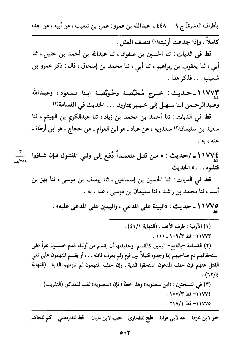 11773 - حَدِيثٌ (قط) : خَرَجَ مُحَيِّصَةُ وَحُوَيْصَةُ ابْنَا مَسْعُودٍ، وَعَبْدُ اللَّهِ وَعَبْدُ الرَّحْمَنِ ابْنَا سَهْلٍ إِلَى خَيْبَرَ يَمْتَارُونَ ... الْحَدِيثُ فِي الْقَسَامَةِ. قط فِي الدِّيَاتِ: ثنا أَحْمَدُ بْنُ مُحَمَّدِ بْنِ زِيَادٍ، ثنا عَبْدُ الْكَرِيمِ، بْنُ الْهَيْثَمِ، ثنا سَعِيدُ بْنُ سُلَيْمَانَ سَعْدَوَيْهِ، عَنْ عَبَّادٍ , هُوَ ابْنُ الْعَوَّامِ، عَنْ حَجَّاجٍ , هُوَ ابْنُ أَرْطَأَةَ، عَنْهُ، بِهِ.