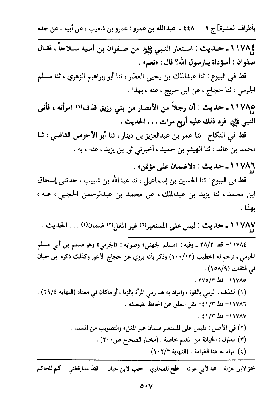 11784 - حَدِيثٌ (قط) : اسْتَعَارَ النَّبِيُّ , صَلَّى اللَّهُ عَلَيْهِ وَسَلَّمَ، مِنْ صَفْوَانَ بْنِ أُمَيَّةَ سِلاحًا، فَقَالَ صَفْوَانُ: أَمُؤَدَّاةٌ يَا رَسُولَ اللَّهِ؟ قَالَ: " نَعَمْ ". قط فِي الْبُيُوعِ: ثنا عَبْدُ الْمَلِكِ بْنُ يَحْيَى الْعَطَّارُ، ثنا أَبُو إِبْرَاهِيمَ الزُّهْرِيُّ، ثنا مُسْلِمٌ الْجَرْمِيُّ، ثنا حَجَّاجٌ، عَنِ ابْنِ جُرَيْجٍ، عَنْهُ، بِهَذَا.