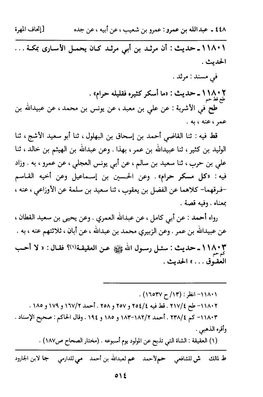 11802 - حَدِيثٌ (طح قط حم) : " مَا أَسْكَرَ كَثِيرُهُ فَقَلِيلُهُ حَرَامٌ ". طح فِي الأَشْرِبَةِ: عَنْ عَلِيِّ بْنِ مَعْبَدٍ، عَنْ يُونُسَ بْنِ مُحَمَّدٍ، عَنْ عُبَيْدِ اللَّهِ بْنِ عُمَرَ، عَنْهُ، بِهِ. قط فِيهِ: ثنا الْقَاضِي أَحْمَدُ بْنُ إِسْحَاقَ بْنِ الْبُهْلُولِ، ثنا أَبُو سَعِيدٍ الأَشَجُّ، ثنا الْوَلِيدُ بْنُ كَثِيرٍ، ثنا عُبَيْدُ اللَّهِ بْنُ عُمَرَ، بِهَذَا. وَعَنْ عَبْدِ اللَّهِ بْنِ الْهَيْثَمِ بْنِ خَالِدٍ، ثنا عَلِيُّ بْنُ حَرْبٍ، ثنا سَعِيدُ بْنُ سَالِمٍ، عَنْ أَبِي يُونُسَ الْعِجْلِيِّ، عَنْ عَمْرٍو، بِهِ. وَزَادَ فِيهِ: " كُلُّ مُسْكِرٍ حَرَامٌ ". وَعَنِ الْحُسَيْنِ بْنِ إِسْمَاعِيلَ، وَعَنْ أَخِيهِ الْقَاسِمِ , فَرَّقَهُمَا , كِلاهُمَا، عَنِ الْفَضْلِ بْنِ يَعْقُوبَ، ثنا سَعِيدُ بْنُ سَلَمَةَ، عَنِ الأَوْزَاعِيِّ، عَنْهُ، بِهِ، بِمَعْنَاهُ. وَفِيهِ قِصَّةٌ. رَوَاهُ أَحْمَدُ: عَنْ أَبِي كَامِلٍ، عَنْ عَبْدِ اللَّهِ الْعُمَرِيِّ. وَعَنْ يَحْيَى بْنِ سَعِيدٍ الْقَطَّانِ، عَنْ عُبَيْدِ اللَّهِ بْنِ عُمَرَ. وَعَنِ الزُّبَيْدِيِّ مُحَمَّدِ بْنِ عَبْدِ اللَّهِ، عَنْ أَبَانٍ، ثَلاثَتُهُمْ عَنْهُ، بِهِ.