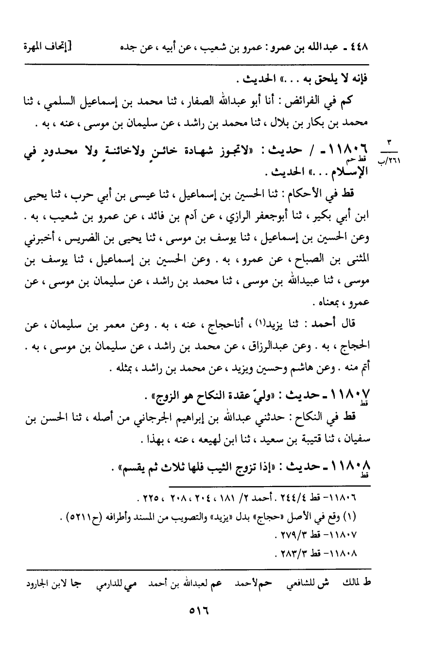 11806 - حَدِيثٌ (قط حم) : " لا تَجُوزُ شَهَادَةُ خَائِنٍ وَلا خَائِنَةٍ وَلا مَحْدُودٍ فِي الإِسْلامِ ... " الْحَدِيثَ. قط فِي الأَحْكَامِ: ثنا الْحُسَيْنُ بْنُ إِسْمَاعِيلَ، ثنا عِيسَى بْنُ أَبِي حَرْبٍ، ثنا يَحْيَى بْنُ أَبِي بُكَيْرٍ، ثنا أَبُو جَعْفَرٍ الرَّازِيُّ، عَنْ آدَمَ بْنِ فَائِدٍ، عَنْ عَمْرِو بْنِ شُعَيْبٍ، بِهِ. وَعَنِ الْحُسَيْنِ بْنِ إِسْمَاعِيلَ، ثنا يُوسُفُ بْنُ مُوسَى، ثنا يَحْيَى بْنُ الضَّرِيسِ، أَخْبَرَنِي الْمُثَنَّى بْنُ الصَّبَّاحِ، عَنْ عَمْرٍو، بِهِ. وَعَنِ الْحُسَيْنِ بْنِ إِسْمَاعِيلَ، ثنا يُوسُفُ بْنُ مُوسَى، ثنا عُبَيْدُ اللَّهِ بْنُ مُوسَى، ثنا مُحَمَّدُ بْنُ رَاشِدٍ، عَنْ سُلَيْمَانَ بْنِ مُوسَى، عَنْ عَمْرٍو، بِمَعْنَاهُ. قَالَ أَحْمَدُ: ثنا يَزِيدُ، أَنَا حَجَّاجٌ، عَنْهُ، بِهِ. وَعَنْ مَعْمَرِ بْنِ سُلَيْمَانَ، عَنِ الْحَجَّاجِ، بِهِ. وَعَنْ عَبْدِ الرَّزَّاقِ، عَنْ مُحَمَّدِ بْنِ رَاشِدٍ، عَنْ سُلَيْمَانَ بْنِ مُوسَى، بِهِ. أَتَمَّ مِنْهُ. وَعَنْ هَاشِمٍ، وَحُسَيْنٍ، وَيَزِيدَ، عَنْ مُحَمَّدِ بْنِ رَاشِدٍ، بِمِثْلِهِ.