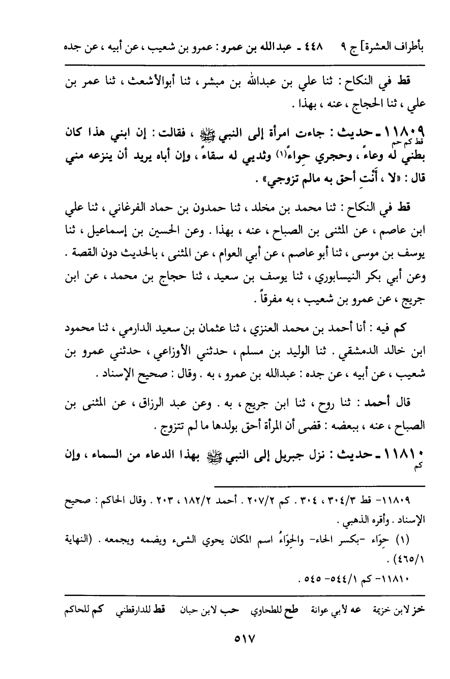 11809 - حَدِيثٌ (قط كم حم) : جَاءَتِ امْرَأَةٌ إِلَى النَّبِيِّ , صَلَّى اللَّهُ عَلَيْهِ وَسَلَّمَ، فَقَالَتْ: إِنَّ ابْنِي هَذَا كَانَ بَطْنِي لَهُ وِعَاءً، وَحِجْرِي حِوَاءً، وَثَدْيِي لَهُ سِقَاءً، وَإِنَّ أَبَاهُ يُرِيدُ أَنْ يَنْزِعَهُ مِنِّي قَالَ: " لا , أَنْتِ أَحَقُّ بِهِ مَا لَمْ تُزَوَّجِي ". قط فِي النِّكَاحِ: ثنا مُحَمَّدُ بْنُ مَخْلَدٍ، ثنا حَمْدُونُ بْنُ حَمَّادٍ الْفَرْغَانِيُّ، ثنا عَلِيُّ بْنُ عَاصِمٍ، عَنِ الْمُثَنَّى بْنِ الصَّبَّاحِ، عَنْهُ، بِهَذَا. وَعَنِ الْحُسَيْنِ بْنِ إِسْمَاعِيلَ، ثنا يُوسُفُ بْنُ مُوسَى، ثنا أَبُو عَاصِمٍ، عَنْ أَبِي الْعَوَّامِ، عَنِ الْمُثَنَّى، بِالْحَدِيثِ دُونَ الْقِصَّةِ. وَعَنْ أَبِي بَكْرٍ النَّيْسَابُورِيِّ، ثَنا يُوسُفُ بْنُ سَعِيدٍ، ثنا حَجَّاجُ بْنُ مُحَمَّدٍ، عَنِ ابْنِ جُرَيْجٍ، عَنْ عَمْرِو بْنِ شُعَيْبٍ، بِهِ مُفَرَّقًا. كم فِيهِ: أَنَا أَحْمَدُ بْنُ مُحَمَّدٍ الْعَنزِيُّ، ثنا عُثْمَانُ بْنُ سَعِيدٍ الدَّارِمِيُّ، ثنا مَحْمُودُ بْنُ خَالِدٍ الدِّمَشْقِيُّ. ثنا الْوَلِيدُ بْنُ مُسْلِمٍ، حَدَّثَنِي عَمْرُو بْنُ شُعَيْبٍ، عَنْ أَبِيهِ، عَنْ جَدِّهِ: عَبْدِ اللَّهِ بْنِ عَمْرٍو، بِهِ. وَقَالَ: صَحِيحُ الإِسْنَادِ. قَالَ أَحْمَدُ: ثنا رَوْحٌ، ثنا ابْنُ جُرَيْجٍ، بِهِ. وَعَنْ عَبْدِ الرَّزَّاقِ، عَنِ الْمُثَنَّى بْنِ الصَّبَّاحِ، عَنْهُ، بِبَعْضِهِ: قَضَى أَنَّ الْمَرْأَةَ أَحَقُّ بِوَلَدِهَا مَا لَمْ تَتَزَوَّجْ.