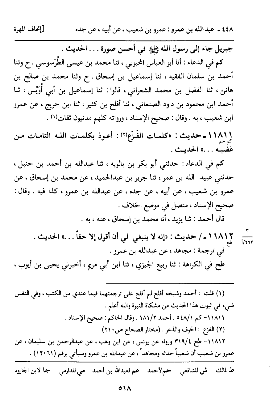 11811 - حَدِيثٌ (كم حم) : " كَلِمَاتُ الْفَزَعِ: أَعُوذُ بِكَلِمَاتِ اللَّهِ التَّامَّاتِ مِنْ غَضَبِهِ ... " الْحَدِيثَ. كم فِي الدُّعَاءِ: حَدَّثَنِي أَبُو بَكْرِ بْنُ بَالَوَيْهِ، ثنا عَبْدُ اللَّهِ بْنُ أَحْمَدَ بْنِ حَنْبَلٍ. حَدَّثَنِي عُبَيْدُ اللَّهِ بْنُ عُمَرَ، ثنا جَرِيرُ بْنُ عَبْدِ الْحَمِيدِ، عَنْ مُحَمَّدِ بْنِ إِسْحَاقَ، عَنْ عَمْرِو بْنِ شُعَيْبٍ، عَنْ أَبِيهِ، عَنْ جَدِّهِ، عَنْ عَبْدِ اللَّهِ بْنِ عَمْرٍو، كَذَا فِيهِ. وَقَالَ: صَحِيحُ الإِسْنَادِ، مُتَّصِلٍ فِي مَوْضِعِ الْخِلافِ. قَالَ أَحْمَدُ: ثنا يَزِيدُ، أَنَا مُحَمَّدُ بْنُ إِسْحَاقَ، عَنْهُ، بِهِ.