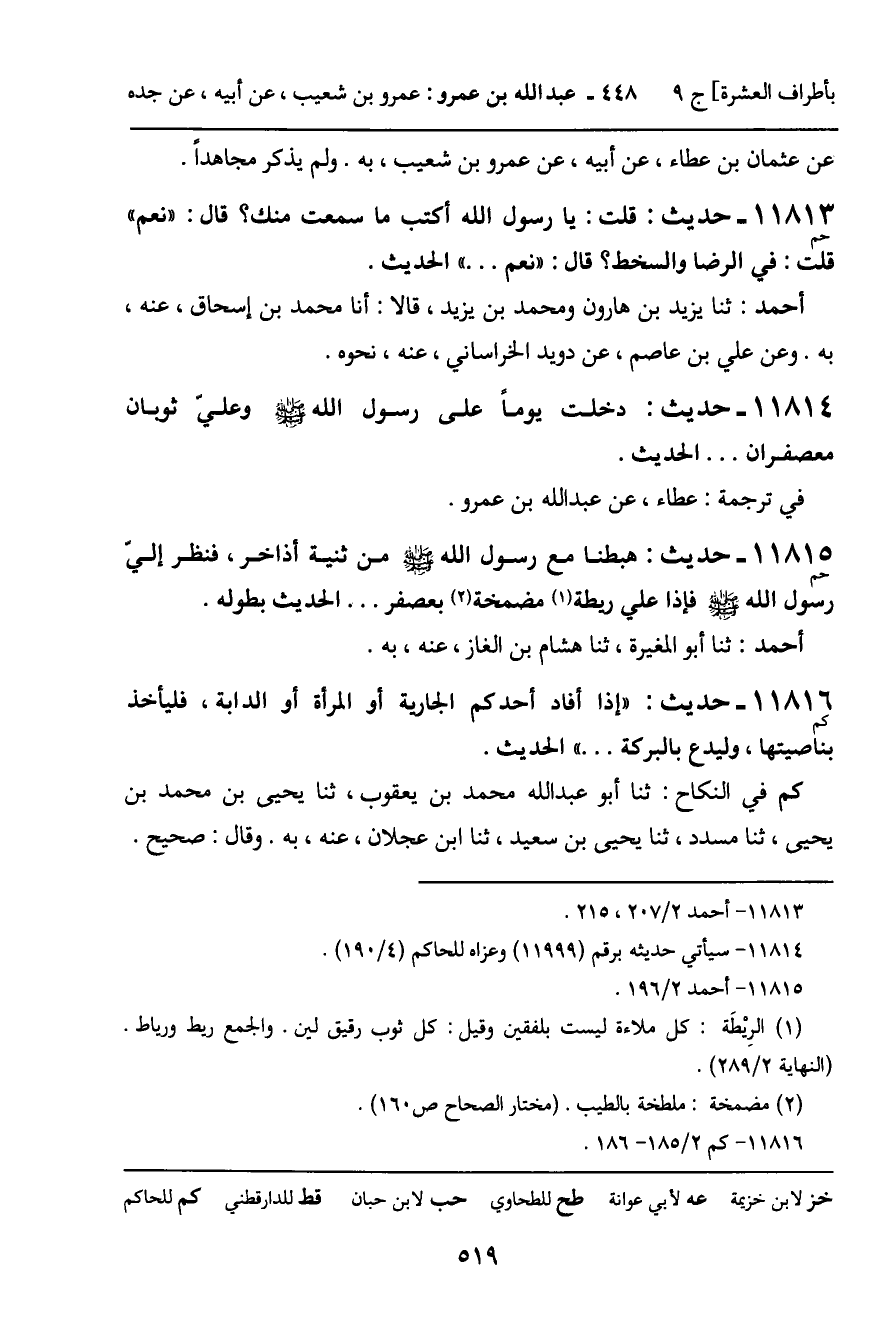 11814 - حَدِيثٌ: دَخَلْتُ يَوْمًا عَلَى رَسُولِ اللَّهِ , صَلَّى اللَّهُ عَلَيْهِ وَسَلَّمَ، وَعَلَيَّ ثَوْبَانِ مُعَصْفَرَانِ ... الْحَدِيثَ. فِي تَرْجَمَةِ: عَطَاءٍ، عَنْ عَبْدِ اللَّهِ بْنِ عَمْرٍو.