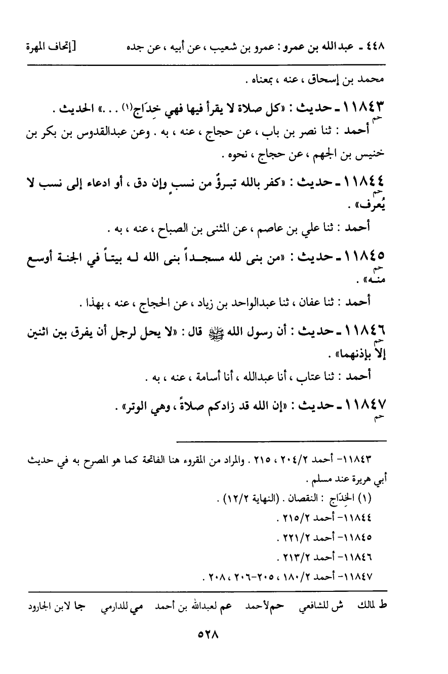 11843 - حَدِيثٌ (حم) : " كُلُّ صَلاةٍ لا يُقْرَأُ فِيهَا فَهِيَ خِدَاجٌ ... " الْحَدِيثَ. أَحْمَدُ: ثنا نَصْرُ بْنُ بَابٍ، عَنْ حَجَّاجٍ، عَنْهُ، بِهِ. وَعَنْ عَبْدِ الْقُدُّوسِ بْنِ بَكْرِ بْنِ خُنَيْسِ بْنِ الْجَهْمِ، عَنْ حَجَّاجٍ، نَحْوَهُ.