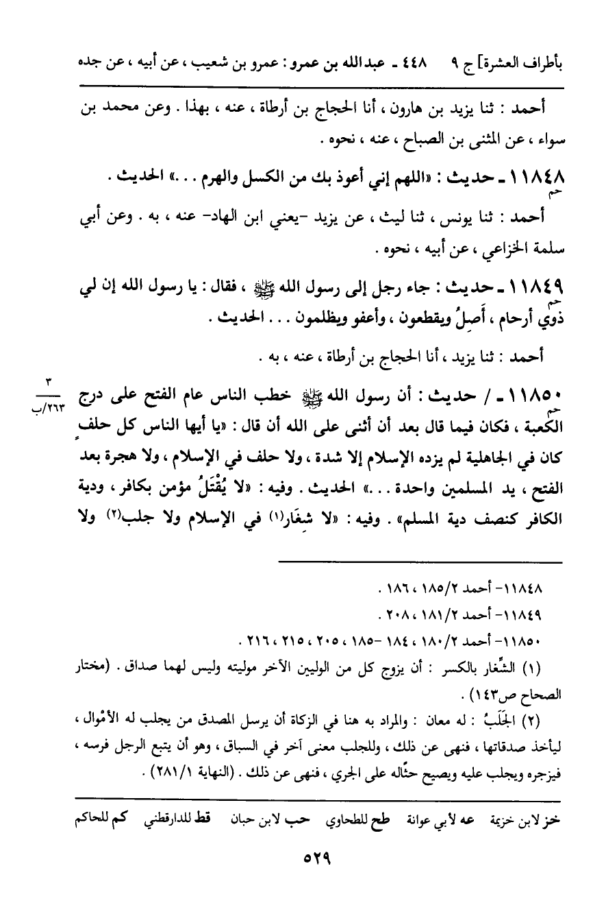 11850 - حَدِيثٌ (حم) : أَنَّ رَسُولَ اللَّهِ , صَلَّى اللَّهُ عَلَيْهِ وَسَلَّمَ، خَطَبَ النَّاسَ عَامَ الْفَتْحِ عَلَى دَرَجِ الْكَعْبَةِ، فَكَانَ فِيمَا قَالَ بَعْدَ أَنْ أَثْنَى عَلَى اللَّهِ , أَنْ قَالَ: " يَأَيُّهَا النَّاسُ , كُلُّ حِلْفٍ كَانَ فِي الْجَاهِلِيَّةِ لَمْ يَزِدْهُ الإِسْلامُ إِلا شِدَّةً، وَلا حِلْفَ فِي الإِسْلامِ، وَلا هِجْرَةَ بَعْدَ الْفَتْحِ، يَدُ الْمُسْلِمِينَ وَاحِدَةٌ ... " الْحَدِيثَ. وَفِيهِ: " لا يُقْتَلُ مُؤْمِنٌ بِكَافِرٍ، وَدِيَةُ الْكَافِرِ كَنِصْفِ دِيَةِ الْمُسْلِمِ ". وَفِيهِ: " لا شِغَارَ فِي الإِسْلامِ، وَلا جَلَبَ وَلا