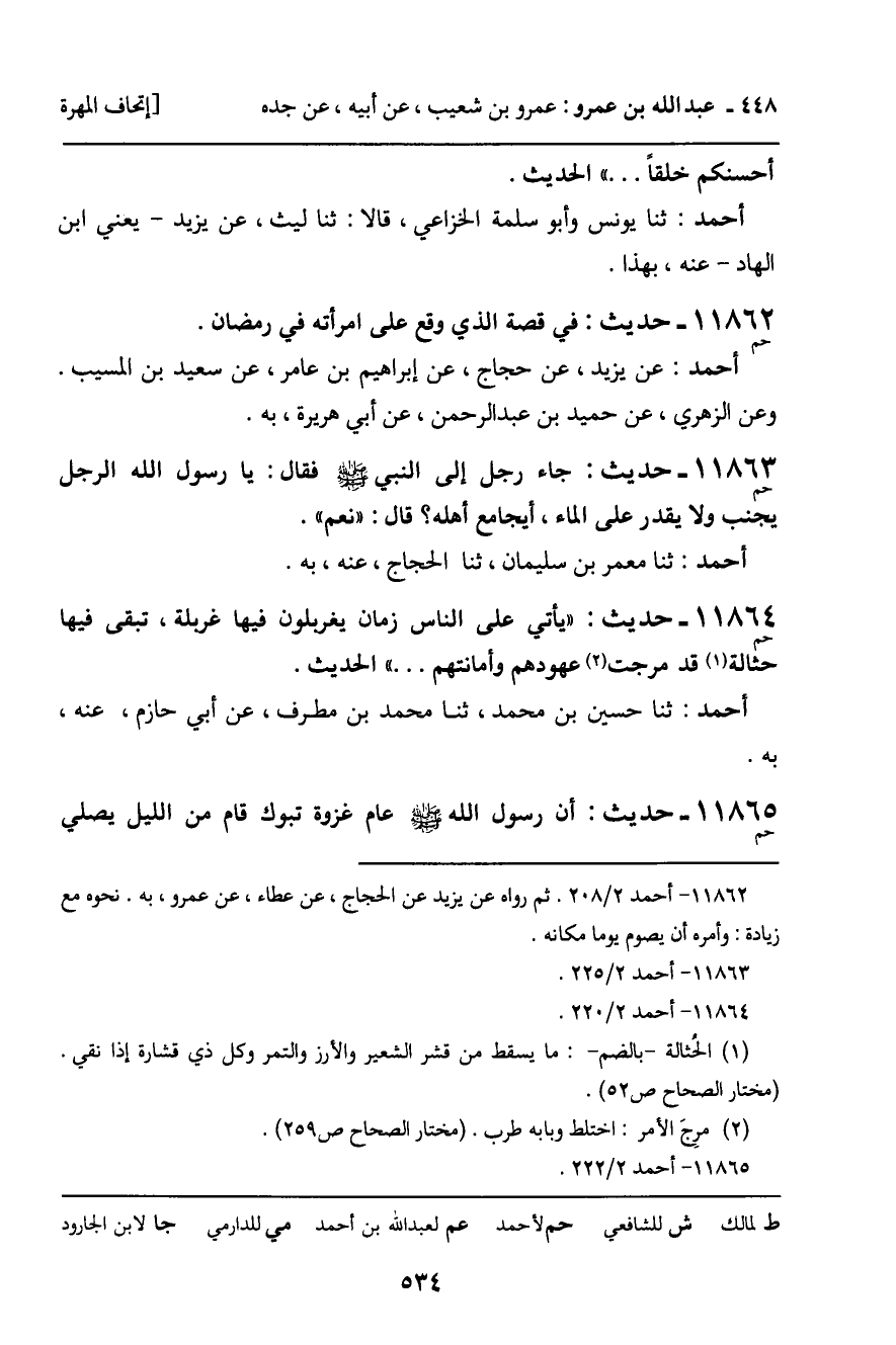 11864 - حَدِيثٌ (حم) : " يَأْتِي عَلَى النَّاسِ زَمَانٌ يُغَرْبَلُونَ فِيهِ غَرْبَلَةً، يَبْقَى مِنْهُمْ حُثَالَةٌ قَدْ مَرِجَتْ عُهُودُهُمْ وَأَمَانَتُهُمْ ... " الْحَدِيثَ. أَحْمَدُ: ثنا حُسَيْنُ بْنُ مُحَمَّدٍ، ثنا مُحَمَّدُ بْنُ مُطَرِّفٍ، عَنْ أَبِي حَازِمٍ، عَنْهُ، بِهِ.