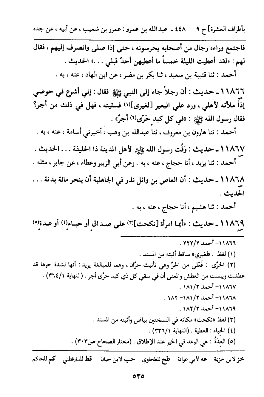 11866 - حَدِيثٌ (حم) : أَنَّ رَجُلا جَاءَ إِلَى النَّبِيِّ , صَلَّى اللَّهُ عَلَيْهِ وَسَلَّمَ، فَقَالَ: إِنِّي أَشْرَعُ فِي حَوْضِي إِذَا مَلأْتُهُ لأَهْلِي، وَرَدَ عَلَيَّ الْبَعِيرُ لِغَيْرِي فَسَقَيْتُهُ، فَهَلْ فِي ذَلِكَ مِنْ أَجْرٍ؟ فَقَالَ رَسُولُ اللَّهِ , صَلَّى اللَّهُ عَلَيْهِ وَسَلَّمَ: " فِي كُلِّ كَبِدٍ حَرَّى أَجْرٌ ". أَحْمَدُ: ثنا هَارُونُ بْنُ مَعْرُوفٍ، ثنا عَبْدُ اللَّهِ بْنُ وَهْبٍ، أَخْبَرَنِي أُسَامَةُ، عَنْهُ، بِهِ.