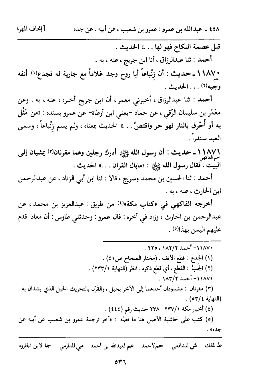 11871 - حَدِيثٌ (حم الْفَاكِهِيُّ) : أَنَّ رَسُولَ اللَّهِ , صَلَّى اللَّهُ عَلَيْهِ وَسَلَّمَ، أَدْرَكَ رَجُلَيْنِ وَهُمَا مُقْرِنَانِ يَمْشِيَانِ إِلَى الْبَيْتِ، فَقَالَ رَسُولُ اللَّهِ , صَلَّى اللَّهُ عَلَيْهِ وَسَلَّمَ: " مَا بَالُ الْقُرانِ ... " الْحَدِيثَ. أَحْمَدُ: ثنا الْحُسَيْنُ بْنُ مُحَمَّدٍ، وَسُرَيْجٌ، قَالا: ثنا ابْنُ أَبِي الزِّنَادِ، عَنْ عَبْدِ الرَّحْمَنِ بْنِ الْحَارِثِ، عَنْهُ، بِهِ. أَخْرَجَهُ الْفَاكِهِيُّ فِي: " كِتَابِ مَكَّةَ " مِنْ طَرِيقِ: عَبْدِ الْعَزِيزِ بْنِ مُحَمَّدٍ، عَنْ عَبْدِ الرَّحْمَنِ بْنِ الْحَارِثِ، وَزَادَ فِي آخِرِه: قَالَ عَمْرٌو: وَحَدَّثَنِي طَاوُسٌ: أَنَّ مُعَاذًا قَدِمَ عَلَيْهِمُ الْيَمَنَ بِهَذَا.