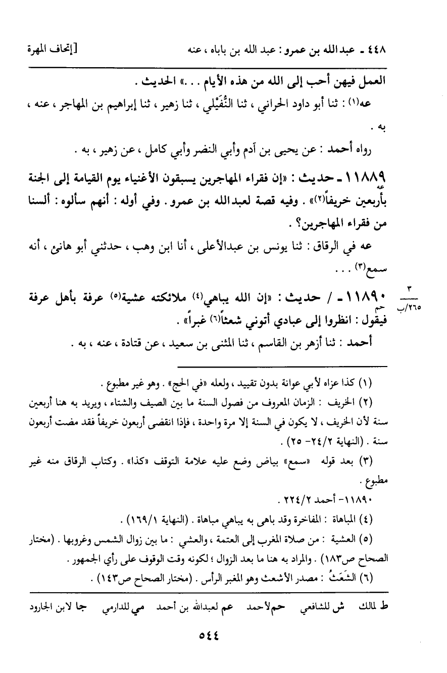 11889 - حَدِيثٌ (عه) : " إِنَّ فُقَرَاءَ الْمُهَاجِرِينَ يَسْبِقُونَ الأَغْنِيَاءَ يَوْمَ الْقِيَامَةِ إِلَى الْجَنَّةِ بِأَرْبَعِينَ خَرِيفًا ". وَفِيهِ قِصَّةٌ لِعَبْدِ اللَّهِ بْنِ عَمْرٍو. وَفِي أَوَّلِهِ: أَنَّهُمْ سَأَلُوهُ: أَلَسْنَا مِنْ فُقَرَاءِ الْمُهَاجِرِينَ؟ عه فِي الرِّقَاقِ: ثنا يُونُسُ بْنُ عَبْدِ الأَعْلَى، أَنَا ابْنُ وَهْبٍ، حَدَّثَنِي أَبُو هَانِئٍ، أَنَّهُ سَمِعَ. . . .