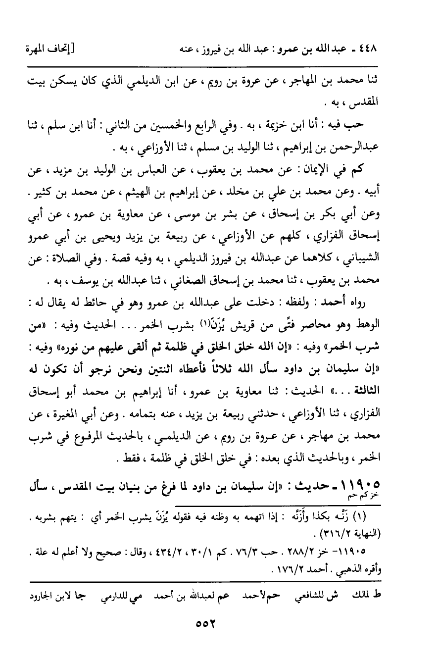 -[553]- اللَّهَ حُكْمًا يُصَادِفُ حُكْمَهُ ... " الْحَدِيثَ. خز فِي الْمَسَاجِدِ: ثنا عُبَيْدُ اللَّهِ بْنُ الْجَهْمِ الأَنْمَاطِيُّ مِصْرِيٌّ، ثنا أَيُّوبُ بْنُ سُوَيْدٍ، عَنْ أَبِي زُرْعَةَ يَحْيَى بْنِ أَبِي عَمْرٍو الشَّيْبَانِيِّ، ثنا ابْنُ الدَّيْلَمِيِّ، بِهِ. وَعَنْ إِبْرَاهِيمَ بْنِ مُنْقِذِ بْنِ عَبْدِ اللَّهِ الْخَوْلانِيِّ، عَنْ أَيُّوبَ بْنِ سُوَيْدٍ، نَحْوَهُ. حب فِي الرَّابِعِ مِنَ الثَّالِثِ: أَنَا عَبْدُ اللَّهِ بْنُ مُحَمَّدِ بْنِ سَلْمٍ، ثنا عَبْدُ الرَّحْمَنِ بْنُ إِبْرَاهِيمَ، ثنا الْوَلِيدُ بْنُ مُسْلِمٍ، ثنا الأَوْزَاعِيُّ، حَدَّثَنِي رَبِيعَةُ بْنُ يَزِيدَ، عَنْ عَبْدِ اللَّهِ بْنِ الدَّيْلَمِيِّ، بِهِ. كم فِي الإِيمَانِ: بِإِسْنَادِ الَّذِي قَبْلَهُ، فِيهِ، وَفِي تَفْسِيرِ ص [سورة: ص، آية 1] : ثنا أَبُو الْعَبَّاسِ، ثنا بَحْرُ بْنُ نَصْرٍ، ثَنا بِشْرُ بْنُ بَكْرٍ، عَنِ الأَوْزَاعِيِّ، بِهِ. وَهُوَ عِنْدَ أَحْمَدَ فِي الْحَدِيثِ الَّذِي قَبْلَهُ.