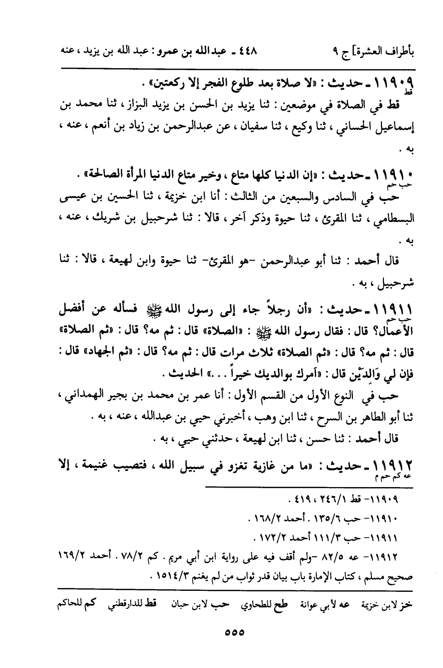 11911 - حَدِيثٌ (حب حم) : " أَنَّ رَجُلا جَاءَ إِلَى رَسُولِ اللَّهِ , صَلَّى اللَّهُ عَلَيْهِ وَسَلَّمَ، فَسَأَلَهُ عَنْ أَفْضَلِ الأَعْمَالِ؟ قَالَ: فَقَالَ رَسُولُ اللَّهِ , صَلَّى اللَّهُ عَلَيْهِ وَسَلَّمَ: " الصَّلاةُ " قَالَ: ثُمَّ مَهْ؟ قَالَ: " ثُمَّ الصَّلاةُ " قَالَ: ثُمَّ مَهْ؟ قَالَ: " ثُمَّ الصَّلاةُ " ثَلاثَ مَرَّاتٍ. قَالَ: ثُمَّ مَهْ؟ قَالَ: " ثُمَّ الْجِهَادُ " قَالَ: فَإِنَّ لِي وَالِدَيْنِ , قَالَ: " آمُرُكَ بِوَالِدَيْكَ خَيْرًا ... " الْحَدِيثَ. حب فِي النَّوْعِ الأَوَّلِ مِنَ الْقِسْمِ الأَوَّلِ: أَنَا عُمَرُ بْنُ مُحَمَّدِ بْنِ بُجَيْرٍ الْهَمْدَانِيُّ، ثنا أَبُو الطَّاهِرِ بْنُ السَّرْحِ، ثنا ابْنُ وَهْبٍ، أَخْبَرَنِي حُيَيُّ بْنُ عَبْدِ اللَّهِ، عَنْهُ، بِهِ. قَالَ أَحْمَدُ: ثنا حَسَنٌ، ثنا ابْنُ لَهِيعَةَ، حَدَّثَنِي حُيَيٌّ، بِهِ.