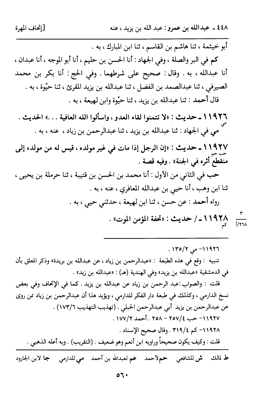 11927 - حَدِيثٌ (حب حم) : " إِنَّ الرَّجُلَ إِذَا مَاتَ فِي غَيْرِ مَوْلِدِهِ، قِيسَ لَهُ مِنْ مَوْلِدِهِ إِلَى مُنْقَطَعِ أَثَرِهِ فِي الْجَنَّةِ ". وَفِيهِ قِصَّةٌ. حب فِي الثَّانِي مِنَ الأَوَّلِ: أَنَا مُحَمَّدُ بْنُ الْحَسَنِ بْنِ قُتَيْبَةَ، ثنا حَرْمَلَةُ بْنُ يَحْيَى، ثنا ابْنُ وَهْبٍ، أَنَا حُيَيُّ بْنُ عَبْدِ اللَّهِ الْمَعَافِرِيُّ، عَنْهُ، بِهِ. رَوَاهُ أَحْمَدُ: عَنْ حَسَنٍ، ثنا ابْنُ لَهِيعَةَ، حَدَّثَنِي حُيَيٌّ، بِهِ.