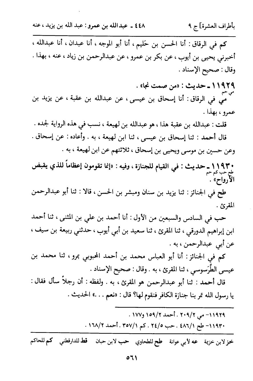 11930 - حَدِيثٌ (طح حب كم حم) : فِي الْقِيَامِ لِلْجَنَازَةِ، وَفِيهِ: " إِنَّمَا تَقُومُونَ إِعْظَامًا لِلَّذِي يَقْبِضُ الأَرْوَاحَ ". طح فِي الْجَنَائِزِ: ثنا يَزِيدُ بْنُ سِنَانٍ، وَمُبَشِّرُ بْنُ الْحَسَنِ، قَالا: ثنا أَبُو عَبْدِ الرَّحْمَنِ الْمُقْرِئُ. حب فِي السَّادِسِ وَالسَّبْعِينَ مِنَ الأَوَّلِ: أَنَا أَحْمَدُ بْنُ عَلِيِّ بْنِ الْمُثَنَّى، ثنا أَحْمَدُ بْنُ إِبْرَاهِيمَ الدَّوْرَقِيُّ، ثنا الْمُقْرِئُ، ثنا سَعِيدُ بْنُ أَبِي أَيُّوبَ، حَدَّثَنِي رَبِيعَةُ بْنُ سَيْفٍ، عَنْ أَبِي عَبْدِ الرَّحْمَنِ، بِهِ. كم فِي الْجَنَائِزِ: أَنَا أَبُو الْعَبَّاسِ مُحَمَّدُ بْنُ أَحْمَدَ الْمَحْبُوبِيُّ بِمَرْوَ، ثنا مُحَمَّدُ بْنُ عِيسَى الطَّرَسُوسِيُّ، ثنا الْمُقْرِئُ، بِهِ. وَقَالَ: صَحِيحُ الإِسْنَادِ. قَالَ أَحْمَدُ: ثنا أَبُو عَبْدِ الرَّحْمَنِ , هُوَ الْمُقْرِئُ، بِهِ. وَلَفْظُهُ: أَنَّ رَجُلا سَأَلَ فَقَالَ: يَا رَسُولَ اللَّهِ، تَمُرُّ بِنَا جَنَازَةُ الْكَافِرِ فَنَقُومُ لَهَا؟ قَالَ: " نَعَمْ ... " الْحَدِيثَ.
