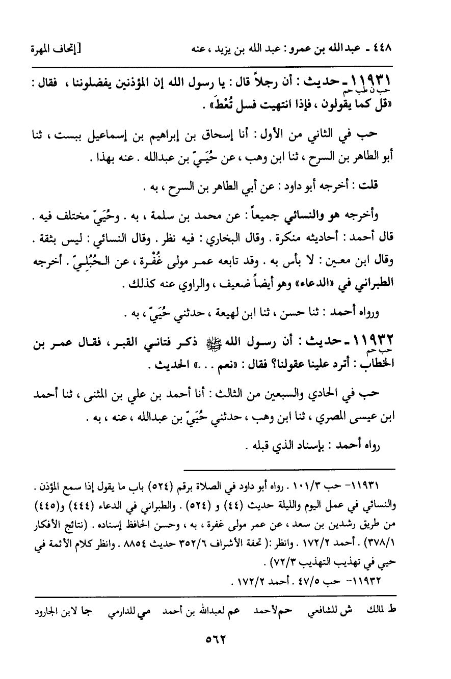 11931 - حَدِيثٌ (حب ن طب حم) : أَنَّ رَجُلا قَالَ: يَا رَسُولَ اللَّهِ، إِنَّ الْمُؤَذِّنِينَ يَفْضُلُونَنَا، فَقَالَ: " قُلْ كَمَا يَقُولُونَ، فَإِذَا انْتَهَيْتَ فَسَلْ تُعْطَ ". حب فِي الثَّانِي مِنَ الأَوَّلِ: أَنَا إِسْحَاقُ بْنُ إِبْرَاهِيمَ بْنِ إِسْمَاعِيلَ بِبُسْتَ، ثنا أَبُو الطَّاهِرِ بْنُ السَّرْحِ، ثنا ابْنُ وَهْبٍ، عَنْ حُيَيِّ بْنِ عَبْدِ اللَّهِ. عَنْهُ بِهَذَا. قُلْتُ: أَخْرَجَهُ أَبُو دَاوُدَ: عَنْ أَبِي الطَّاهِرِ بْنِ السَّرْحِ، بِهِ. وَأَخْرَجَهُ هُوَ وَالنَّسَائِيُّ جَمِيعًا: عَنْ مُحَمَّدِ بْنِ سَلَمَةَ، بِهِ. وَحُيَيٌّ مُخْتَلَفٌ فِيهِ. قَالَ أَحْمَدُ: أَحَادِيثُهُ مُنْكَرَةٌ. وَقَالَ الْبُخَارِيُّ: فِيهِ نَظَرٌ. وَقَالَ النَّسَائِيُّ: لَيْسَ بِثِقَةٍ. وَقَالَ ابْنُ مَعِينٍ: لا بَأْسَ بِهِ. وَقَدْ تَابَعَهُ عَمْرٌو , مَوْلَى غُفْرَةَ، عَنِ الْحُبُلِيِّ. أَخْرَجَهُ الطَّبَرَانِيُّ فِي (الدُّعَاءِ) وَهُوَ أَيْضًا ضَعِيفٌ، وَالرَّاوِي عَنْهُ كَذَلِكَ. وَرَوَاهُ أَحْمَدُ: ثنا حَسَنٌ، ثنا ابْنُ لَهِيعَةَ، حَدَّثَنِي حُيَيٌّ، بِهِ.