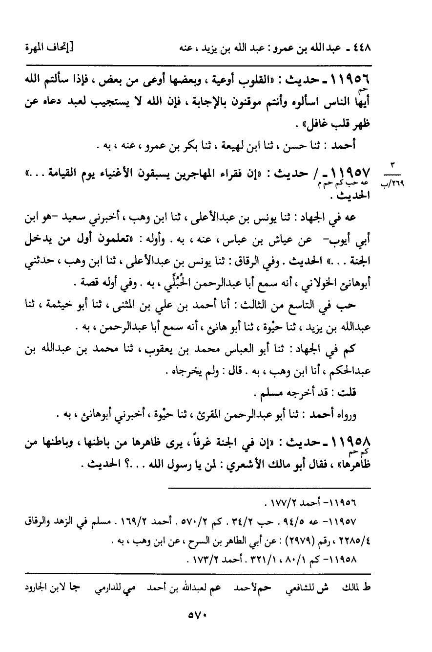 11957 - حَدِيثٌ (عه حب كم حم م) : " إِنَّ فُقَرَاءَ الْمُهَاجِرِينَ يَسْبِقُونَ الأَغْنِيَاءَ يَوْمَ الْقِيَامَةِ ... " الْحَدِيثَ. عه فِي الْجِهَادِ: ثنا يُونُسُ بْنُ عَبْدِ الأَعْلَى، ثنا ابْنُ وَهْبٍ، أَخْبَرَنِي سَعِيدٌ , هُوَ ابْنُ أَبِي أَيُّوبَ، عَنْ عَيَّاشِ بْنِ عَبَّاسٍ، عَنْهُ، بِهِ. وَأَوَّلُهُ: " تَعْلَمُونَ أَوَّلَ مَنْ يَدْخُلُ الْجَنَّةَ ... " الْحَدِيثَ. وَفِي الرِّقَاقِ: ثنا يُونُسُ بْنُ عَبْدِ الأَعْلَى، ثنا ابْنُ وَهْبٍ، حَدَّثَنِي أَبُو هَانِئٍ الْخَوْلانِيُّ، أَنَّهُ سَمِعَ أَبَا عَبْدِ الرَّحْمَنِ الْحُبُلِيَّ، بِهِ. وَفِي أَوَّلِهِ قِصَّةٌ. حب فِي التَّاسِعِ مِنَ الثَّالِثِ: أَنَا أَحْمَدُ بْنُ عَلِيِّ بْنِ الْمُثَنَّى، ثنا أَبُو خَيْثَمَةَ، ثَنا عَبْدُ اللَّهِ بْنُ يَزِيدَ، ثنا حَيْوَةُ، ثنا أَبُو هَانِئٍ، أَنَّهُ سَمِعَ أَبَا عَبْدِ الرَّحْمَنِ، بِهِ. كم فِي الْجِهَادِ: ثنا أَبُو الْعَبَّاسِ مُحَمَّدُ بْنُ يَعْقُوبَ، ثنا مُحَمَّدُ بْنُ عَبْدِ اللَّهِ بْنِ عَبْدِ الْحَكَمِ، أَنَا ابْنُ وَهْبٍ، بِهِ. قَالَ: وَلَمْ يُخَرِّجَاهُ. قُلْتُ: قَدْ أَخْرَجَهُ مُسْلِمٌ. وَرَوَاهُ أَحْمَدُ: ثنا أَبُو عَبْدِ الرَّحْمَنِ الْمُقْرِئُ، ثنا حَيْوَةُ، أَخْبَرَنِي أَبُو هَانِئٍ، بِهِ.