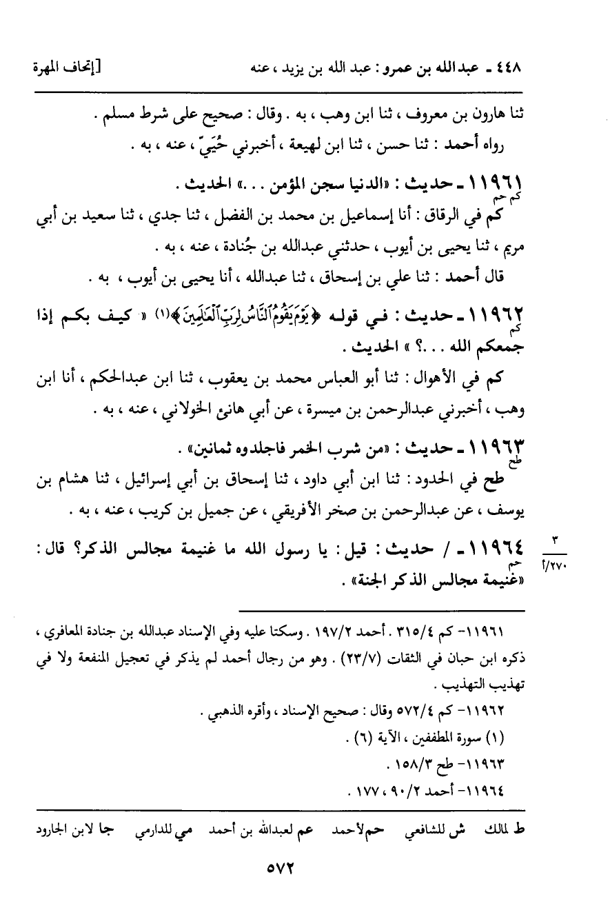 11961 - حَدِيثٌ (كم حم) : " الدُّنْيَا سِجْنُ الْمُؤْمِنِ ... " الْحَدِيثَ. كم فِي الرِّقَاقِ: أَنَا إِسْمَاعِيلُ بْنُ مُحَمَّدِ بْنِ الْفَضْلِ، ثَنا جَدِّي، ثنا سَعِيدُ بْنُ أَبِي مَرْيَمَ، ثنا يَحْيَى بْنُ أَيُّوبَ، حَدَّثَنِي عَبْدُ اللَّهِ بْنُ جُنَادَةَ، عَنْهُ، بِهِ. قَالَ أَحْمَدُ: ثنا عَلِيُّ بْنُ إِسْحَاقَ، ثنا عَبْدُ اللَّهِ، أَنَا يَحْيَى بْنُ أَيُّوبَ، بِهِ.