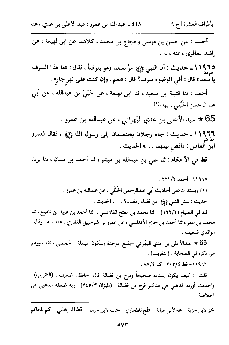 11965 - حَدِيثٌ (حم قط) : أَنَّ النَّبِيَّ , صَلَّى اللَّهُ عَلَيْهِ وَسَلَّمَ، مَرَّ بِسَعْدٍ وَهُوَ يَتَوَضَّأُ، فَقَالَ: " مَا هَذَا السَّرَفُ يَا سَعْدُ؟ " قَالَ: أَفِي الْوُضُوءِ سَرَفٌ؟ قَالَ: " نَعَمْ، وَإِنْ كُنْتَ عَلَى نَهْرٍ جَارٍ ". أَحْمَدُ: ثنا قُتَيْبَةُ بْنُ سَعِيدٍ، ثنا ابْنُ لَهِيعَةَ، عَنْ حُيَيِّ بْنِ عَبْدِ اللَّهِ، عَنْ أَبِي عَبْدِ الرَّحْمَنِ الْحُبُلِيِّ، بِهَذَا.