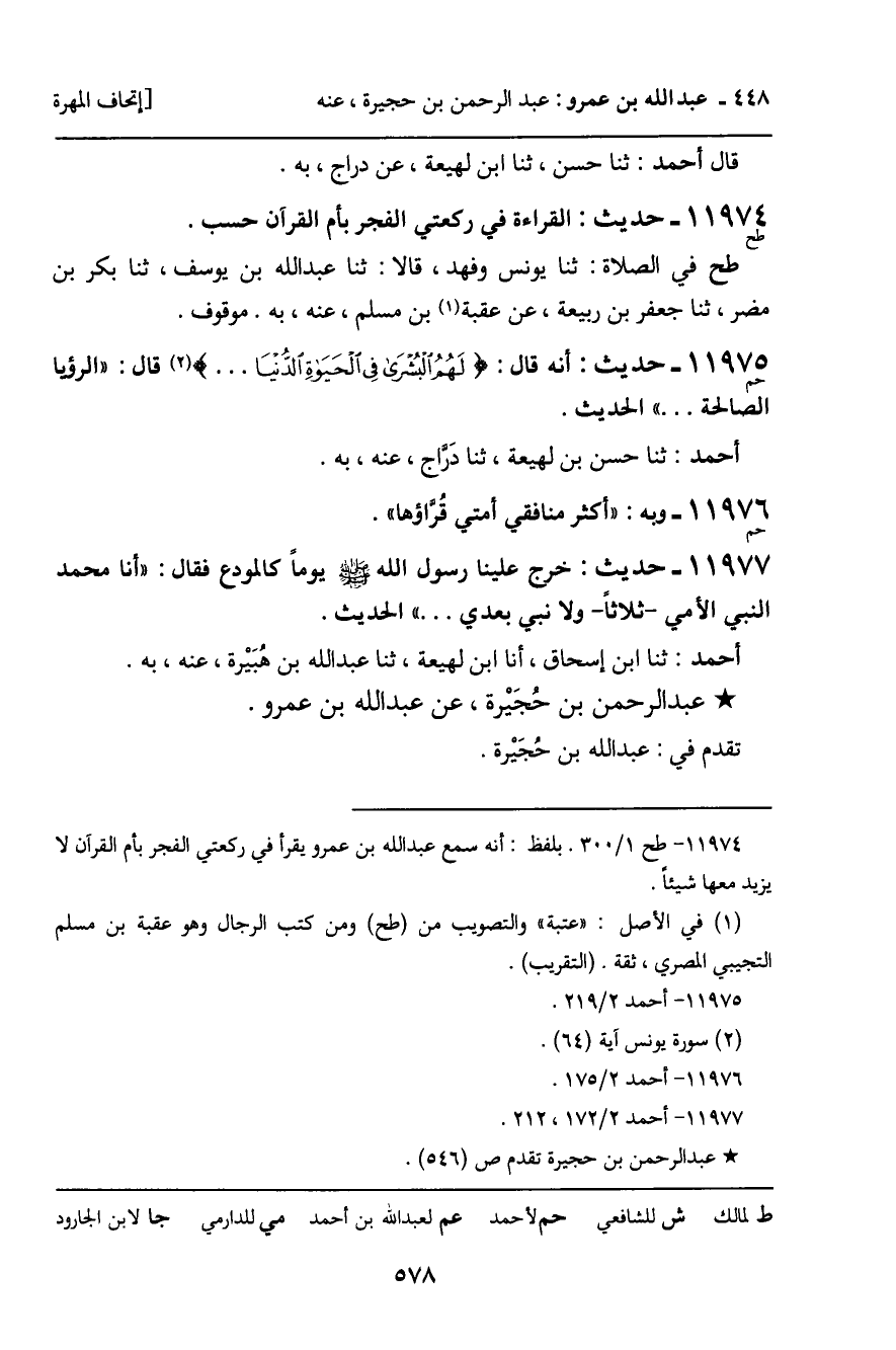 ـ عَبْدُ الرَّحْمَنِ بْنُ حُجَيْرَةَ، عَنْ عَبْدِ اللَّهِ بْنِ عَمْرٍو. تَقَدَّمَ فِي: عَبْدِ اللَّهِ بْنِ حُجَيْرَةَ.