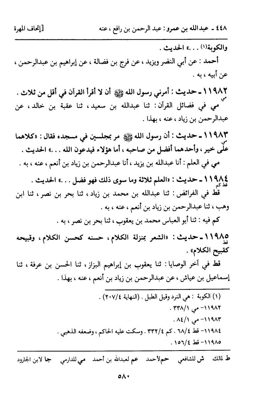 11984 - حَدِيثٌ (قط كم) : " الْعِلْمُ ثَلاثَةٌ وَمَا سِوَى ذَلِكَ فَهُوَ فَضْلٌ ... " الْحَدِيثَ. قط فِي الْفَرَائِضِ: ثنا عَبْدُ اللَّهِ بْنُ مُحَمَّدِ بْنِ زِيَادٍ، ثنا بَحْرُ بْنُ نَصْرٍ، ثنا ابْنُ وَهْبٍ، ثنا عَبْدُ الرَّحْمَنِ بْنُ زِيَادِ بْنِ أَنْعُمٍ، عَنْهُ، بِهِ. كم فِيهِ: ثنا أَبُو الْعَبَّاسِ مُحَمَّدُ بْنُ يَعْقُوبَ، ثنا بَحْرُ بْنُ نَصْرٍ، بِهِ.