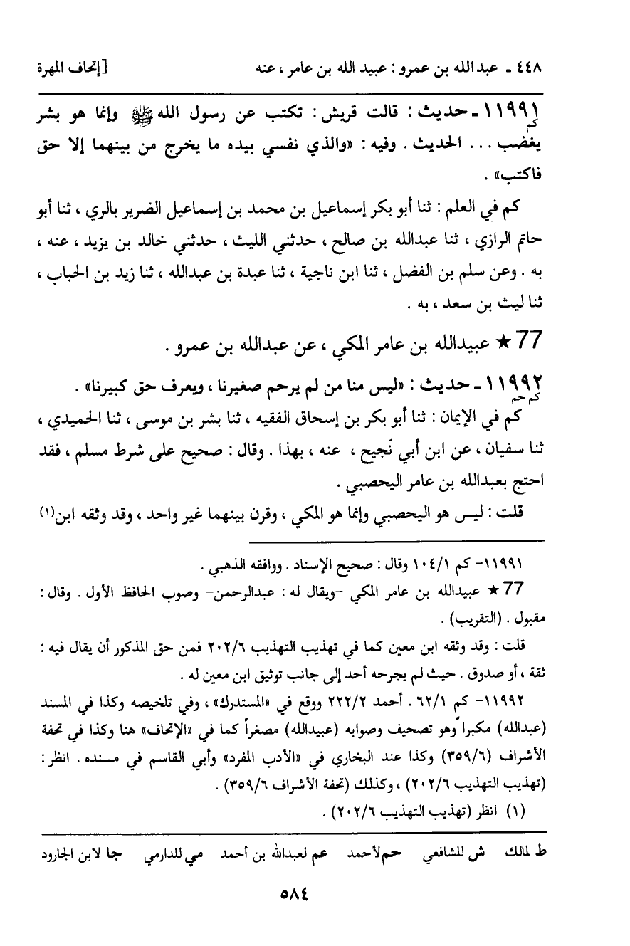 11992 - حَدِيثٌ (كم حم) : " لَيْسَ مِنَّا مَنْ لَمْ يَرْحَمْ صَغِيرَنَا، وَيَعْرِفْ حَقَّ كَبِيرِنَا ". كم فِي الإِيمَانِ: ثنا أَبُو بَكْرِ بْنُ إِسْحَاقَ الْفَقِيهُ، ثنا بِشْرُ بْنُ مُوسَى، ثنا الْحُمَيْدِيُّ، ثنا سُفْيَانُ، عَنِ ابْنِ أَبِي نَجِيحٍ، عَنْهُ، بِهَذَا. وَقَالَ: صَحِيحٌ عَلَى شَرْطِ مُسْلِمٍ، فَقَدِ احْتُجَّ بِعَبْدِ اللَّهِ بْنِ عَامِرٍ الْيَحْصِبِيِّ. قُلْتُ: لَيْسَ هُوَ الْيَحْصِبِيُّ وَإِنَّمَا هُوَ الْمَكِّيُّ، وَقَرَنَ بَيْنَهُمَا غَيْرُ وَاحِدٍ، وَقَدْ وَثَّقَهُ ابْنُ