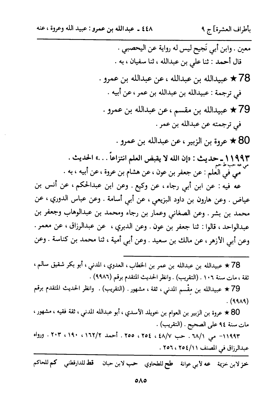 11993 - حَدِيثٌ (مي عه حب ط حم) : " إِنَّ اللَّهَ لا يَقْبِضُ الْعِلْمَ انْتِزَاعًا ... " الْحَدِيثَ. مي فِي الْعِلْمِ: عَنْ جَعْفَرِ بْنِ عَوْنٍ، عَنْ هِشَامِ بْنِ عُرْوَةَ، عَنْ أَبِيهِ، بِهِ. عه فِيهِ: عَنِ ابْنِ أَبِي رَجَاءٍ، عَنْ وَكِيعٍ. وَعَنِ ابْنِ عَبْدِ الْحَكَمِ، عَنْ أَنَسِ بْنِ عِيَاضٍ. وَعَنْ هَارُونَ بْنِ دَاوُدَ الْبَزِيعِيِّ، عَنْ أَبِي أُسَامَةَ. وَعَنْ عَبَّاسٍ الدُّورِيِّ، عَنْ مُحَمَّدِ بْنِ بِشْرٍ. وَعَنِ الصَّغَانِيِّ، وَعَمَّارِ بْنِ رَجَاءٍ، وَمُحَمَّدِ بْنِ عَبْدِ الْوَهَّابِ، وَجَعْفَرِ بْنِ عَبْدِ الْوَاحِدِ، قَالُوا: ثنا جَعْفَرُ بْنُ عَوْنٍ. وَعَنِ الدَّبَرِيِّ، عَنْ عَبْدِ الرَّزَّاقِ، عَنْ مَعْمَرٍ. وَعَنْ أَبِي الأَزْهَرِ، عَنْ مَالِكِ بْنِ سَعِيدٍ. وَعَنْ أَبِي أُمَيَّةَ، ثنا مُحَمَّدُ بْنُ كُنَاسَةَ. وَعَنْ