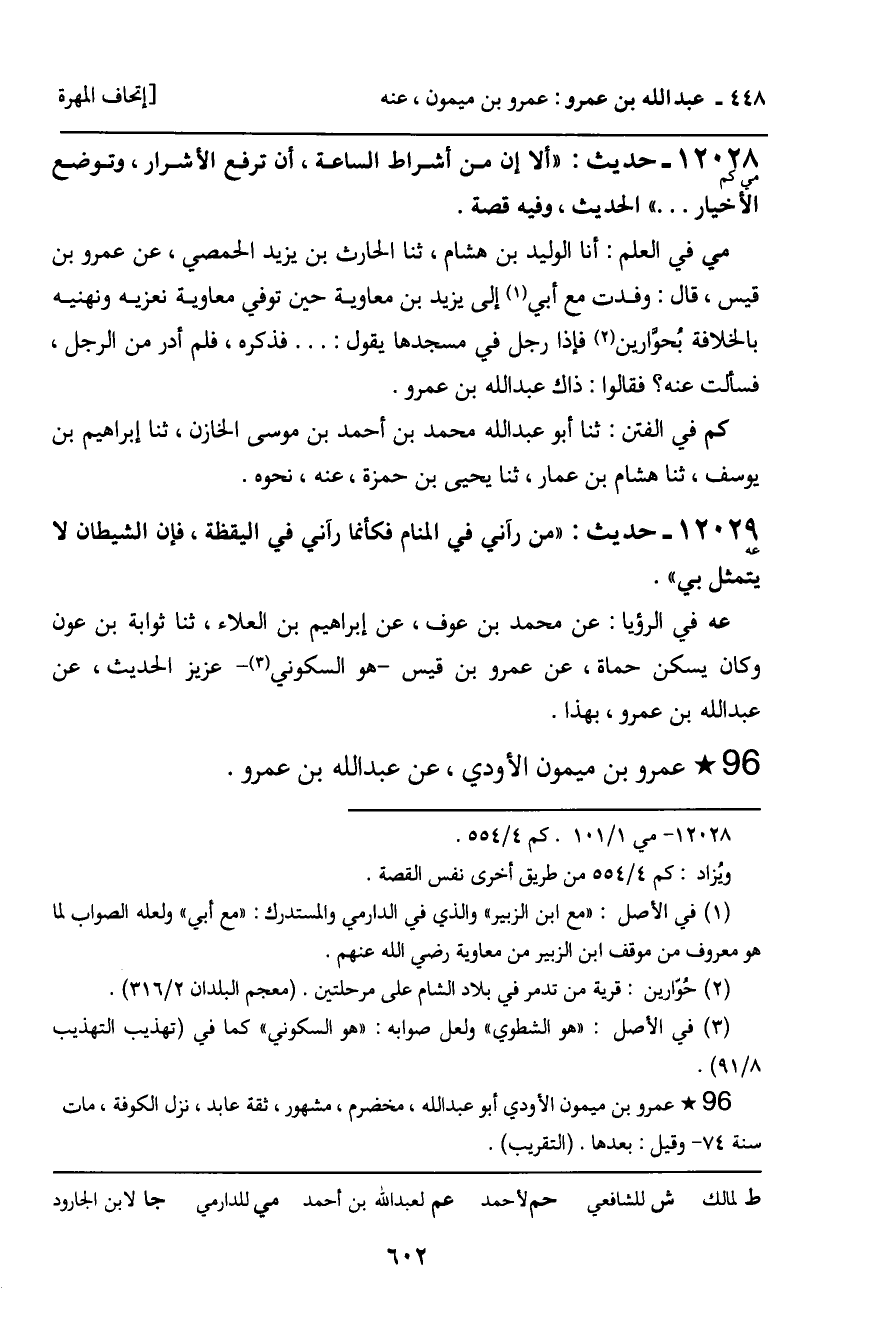 12028 - حَدِيثٌ (مي كم) : " أَلا إِنَّ مِنْ أَشْرَاطِ السَّاعَةِ، أَنْ تُرْفَعَ الأَشْرَارُ، وَتُوضَعَ الأَخْيَارُ ... " الْحَدِيثَ، وَفِيهِ قِصَّةٌ. مي فِي الْعِلْمِ: أَنَا الْوَلِيدُ بْنُ هِشَامٍ، ثنا الْحَارِثُ بْنُ يَزِيدَ الْحِمْصِيُّ، عَنْ عَمْرِو بْنِ قَيْسٍ، قَالا: وَفَدْتُ مَعَ أَبِي إِلَى يَزِيدَ بْنِ مُعَاوِيَةَ حِينَ تُوُفِّيَ مُعَاوِيَةُ نُعَزِّيهِ وَنُهَنِّيهِ بِالْخِلافَةِ بِحِوَارَيْنِ , فَإِذَا رَجُلٌ فِي مَسْجِدِهَا يَقُولُ: ... . فَذَكَرَهُ، فَلَمْ أَدْرِ مَنِ الرَّجُلِ، فَسَأَلْتُ عَنْهُ؟ فَقَالُوا: ذَاكَ عَبْدُ اللَّهِ بْنُ عَمْرٍو. كم فِي الْفِتَنِ: ثنا أَبُو عَبْدِ اللَّهِ مُحَمَّدُ بْنُ أَحْمَدَ بْنِ مُوسَى الْخَازِنُ، ثنا إِبْرَاهِيمُ بْنُ يُوسُفَ، ثنا هِشَامُ بْنُ عَمَّارٍ، ثنا يَحْيَى بْنُ حَمْزَةَ، عَنْهُ، نَحْوَهُ.
