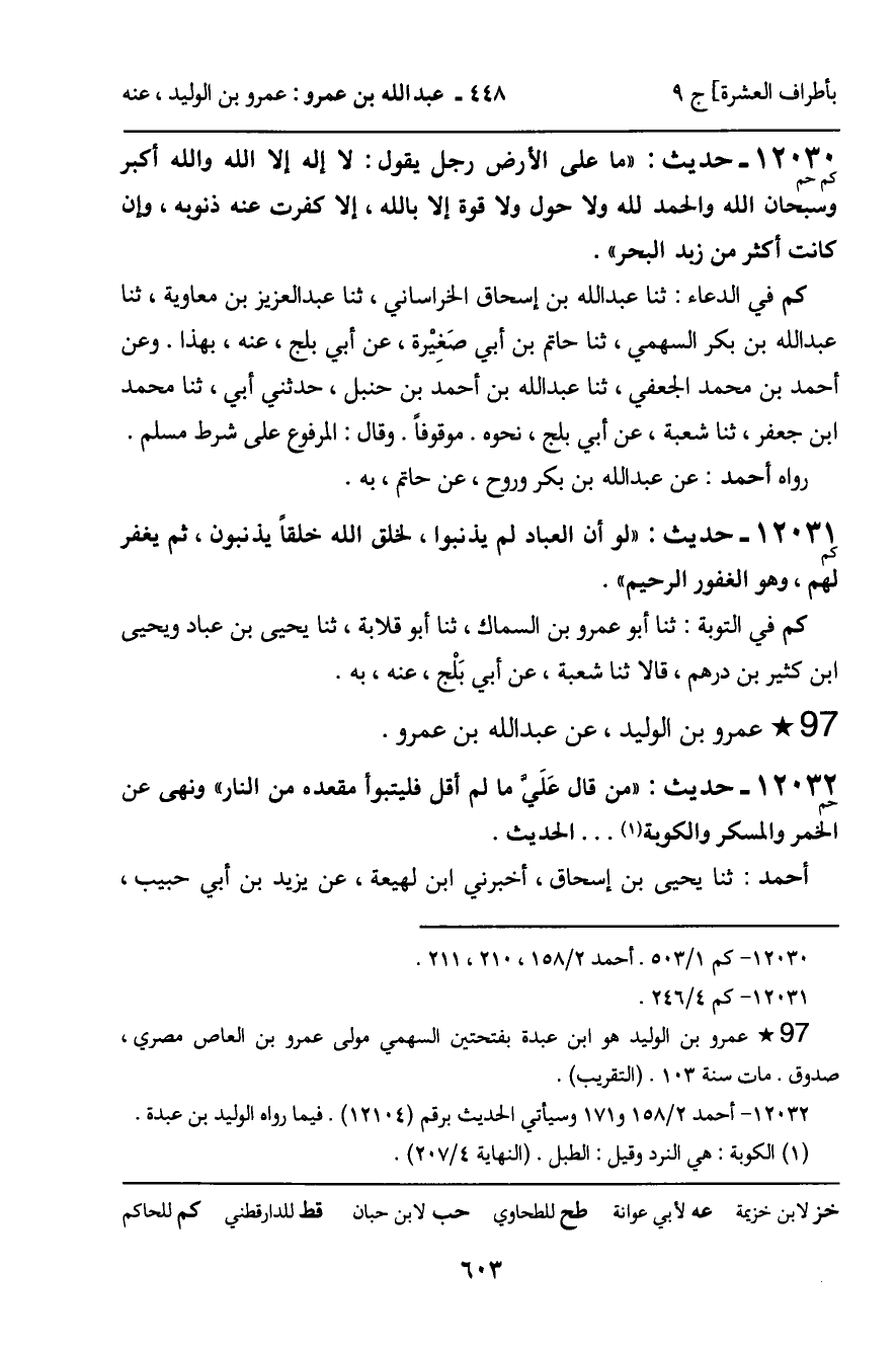 12030 - حَدِيثٌ (كم حم) : " مَا عَلَى الأَرْضِ رَجُلٌ يَقُولُ: لا إِلَهَ إِلا اللَّهُ وَاللَّهُ أَكْبَرُ وَسُبْحَانَ اللَّهِ وَالْحَمْدُ لِلَّهِ وَلا حَوْلَ وَلا قُوَّةَ إِلا بِاللَّهِ، إِلا كَفَّرَتْ عَنْهُ ذُنُوبَهُ، إِنْ كَانَتْ أَكْثَرَ مِنْ زَبَدِ الْبَحْرِ ". كم فِي الدُّعَاءِ: ثَنا عَبْدُ اللَّهِ بْنُ إِسْحَاقَ الْخُرَاسَانِيُّ، ثنا عَبْدُ الْعَزِيزِ بْنُ مُعَاوِيَةَ، ثنا عَبْدُ اللَّهِ بْنُ بَكْرٍ السَّهْمِيُّ، ثنا حَاتِمُ بْنُ أَبِي صَغِيرَةَ، عَنْ أَبِي بَلْجٍ، عَنْهُ، بِهَذَا. وَعَنْ أَحْمَدَ بْنِ مُحَمَّدٍ الْجُعْفِيِّ، ثنا عَبْدُ اللَّهِ بْنُ أَحْمَدَ بْنِ حَنْبَلٍ، حَدَّثَنِي أَبِي، ثنا مُحَمَّدُ بْنُ جَعْفَرٍ، ثنا شُعْبَةُ، عَنْ أَبِي بَلْجٍ، نَحْوَهُ. مَوْقُوفًا. وَقَالَ: الْمَرْفُوعُ عَلَى شَرْطِ مُسْلِمٍ. رَوَاهُ أَحْمَدُ: عَنْ عَبْدِ اللَّهِ بْنِ بَكْرٍ، وَرَوْحٍ، عَنْ حَاتِمٍ، بِهِ.