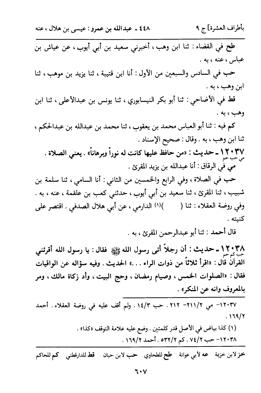 12037 - حَدِيثٌ (مي حب حم) : " مَنْ حَافَظَ عَلَيْهَا كَانَتْ لَهُ نُورًا وَبُرْهَانًا ". يَعْنِي: الصَّلاةَ. مي فِي الرِّقَاقِ: أَنَا عَبْدُ اللَّهِ بْنُ يَزِيدَ الْمُقْرِئُ. حب فِي الصَّلاةِ، وَفِي الرَّابِعِ وَالْخَمْسِينَ مِنَ الثَّانِي: أَنَا السَّامِيُّ، ثنا سَلَمَةُ بْنُ شَبِيبٍ، ثنا الْمُقْرِئُ، ثنا سَعِيدُ بْنُ أَبِي أَيُّوبَ، حَدَّثَنِي كَعْبُ بْنُ عَلْقَمَةَ، عَنْهُ، بِهِ. وَفِي رَوْضَةِ الْعُقَلاءِ: ثنا ( ... ) الدَّارِمِيُّ، عَنْ أَبِي هِلالٍ الصَّدَفِيِّ. اقْتَصَرَ عَلَى كُنْيَتِهِ. قَالَ أَحْمَدُ: ثنا أَبُو عَبْدِ الرَّحْمَنِ الْمُقْرِئُ، بِهِ.