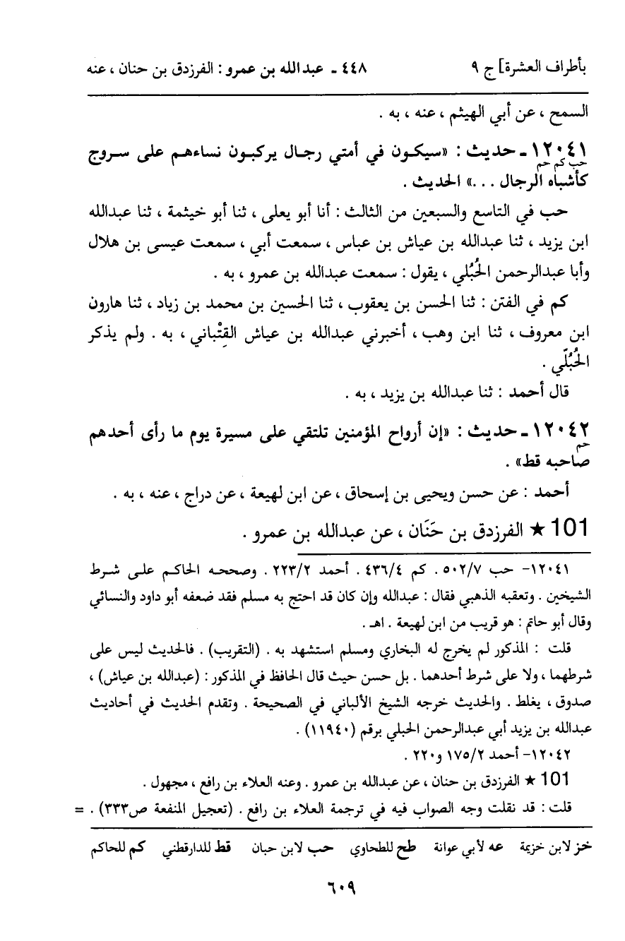 12041 - حَدِيثٌ (حب كم حم) : " سَيَكُونُ فِي أُمَّتِي رِجَالٌ يُرْكِبُونَ نِسَاءَهُمْ عَلَى سُرُوجٍ كَأَشْبَاهِ الرِّجَالِ ... " الْحَدِيثَ. حب فِي التَّاسِعِ وَالسَّبْعِينَ مِنَ الثَّالِثِ: أَنَا أَبُو يَعْلَى، ثنا أَبُو خَيْثَمَةَ، ثَنا عَبْدُ اللَّهِ بْنُ يَزِيدَ، ثنا عَبْدُ اللَّهِ بْنُ عَيَّاشِ بْنِ عَبَّاسٍ، سَمِعْتُ أَبِي، سَمِعْتُ عِيسَى بْنَ هِلالٍ، وَأَبَا عَبْدِ الرَّحْمَنِ الْحُبُلِيَّ، يَقُولُ: سَمِعْتُ عَبْدَ اللَّهِ بْنَ عَمْرٍو، بِهِ. كم فِي الْفِتَنِ: ثنا الْحَسَنُ بْنُ يَعْقُوبَ، ثنا الْحُسَيْنُ بْنُ مُحَمَّدِ بْنِ زِيَادٍ، ثنا هَارُونُ بْنُ مَعْرُوفٍ، ثنا ابْنُ وَهْبٍ، أَخْبَرَنِي عَبْدُ اللَّهِ بْنُ عَيَّاشٍ الْقِتْبَانِيُّ، بِهِ. وَلَمْ يَذْكُرِ الْحُبُلِيَّ. قَالَ أَحْمَدُ: ثنا عَبْدُ اللَّهِ بْنُ يَزِيدَ، بِهِ.