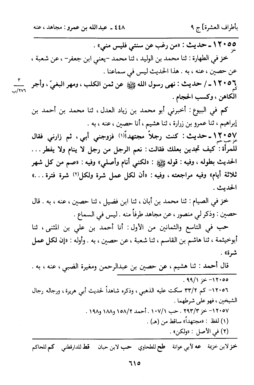 12057 - حَدِيثٌ (خز حب حم) : كُنْتُ رَجُلا مُجْتَهِدًا فَزَوَّجَنِي أَبِي، ثُمَّ زَارَنِي فَقَالَ لِلْمَرْأَةِ: كَيْفَ تَجِدِينَ بَعْلَكِ؟ فَقَالَتْ: نِعْمَ الرَّجُلُ مِنْ رَجُلٍ لا يَنَامُ وَلا يُفْطِرُ ... الْحَديِثَ بِطُولِهِ، وَفِيهِ: قَوْلُهُ , صَلَّى اللَّهُ عَلَيْهِ وَسَلَّمَ: " لَكِنِّي أَنَامُ وَأُصَلِّي " وَفِيهِ: " صُمْ مِنْ كُلِّ شَهْرٍ ثَلاثَةَ أَيَّامٍ " وَفِيهِ مُرَاجَعَتُهُ، وَفِيهِ: " إِنَّ لِكُلِّ عَمَلٍ شِرَّةً وَلِكُلِّ شِرَّةً فِتْرَةٌ ... " الْحَدِيثَ. خز فِي الصِّيَامِ: ثنا مُحَمَّدُ بْنُ أَبَانٍ، ثنا ابْنُ فُضَيْلٍ، ثنا حُصَيْنٌ، عَنْهُ، بِهِ. قَالَ حُصَيْنٌ: وَذَكَرَ لِي مَنْصُورٌ، عَنْ مُجَاهِدٍ طَرَفًا مِنْهُ. لَيْسَ فِي السَّمَاعِ. حب فِي التَّاسِعِ وَالثَّمَانِينَ مِنَ الأَوَّلِ: أَنَا أَحْمَدُ بْنُ عَلِيِّ بْنِ الْمُثَنَّى، ثنا أَبُو خَيْثَمَةَ، ثنا هَاشِمُ بْنُ الْقَاسِمِ، ثنا شُعْبَةُ، عَنْ حُصَيْنٍ، بِهِ. وَأَوَّلُهُ: " إِنَّ لِكُلِّ عَمَلٍ شِرَّةً ". قَالَ أَحْمَدُ: ثنا هُشَيْمٌ، عَنْ حُصَيْنِ بْنِ عَبْدِ الرَّحْمَنِ، وَمُغِيرَةَ الضَّبِّيِّ، عَنْهُ، بِهِ.