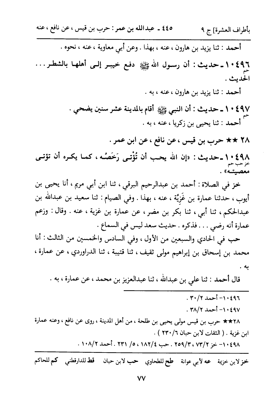 10498 - حَدِيثٌ (خز حب حم) : " إِنَّ اللَّهَ يُحِبُّ أَنْ تُؤْتَى رُخَصُهُ , كَمَا يَكْرَهُ أَنْ تُؤْتَى مَعْصِيَتُهُ ". خز فِي الصَّلاةِ: أَحْمَدُ بْنُ عَبْدِ الرَّحِيمِ الْبَرْقِيُّ , ثنا ابْنُ أَبِي مَرْيَمَ , أَنَا يَحْيَى بْنُ أَيُّوبَ , حَدَّثَنَا عُمَارَةُ بْنُ غَزِيَّةَ , عَنْهُ , بِهَذَا. وَفِي الصِّيَامِ: ثنا سَعِيدُ بْنُ عَبْدِ اللَّهِ بْنِ عَبْدِ الْحَكَمِ , ثنا أَبِي , ثنا بَكْرُ بْنُ مُضَرَ , عَنْ عُمَارَةَ بْنِ غَزِيَّةَ , عَنْهُ. وَقَالَ: وَزَعَمَ عُمَارَةُ أَنَّهُ رَضِيَ ... فَذَكَرَهُ. حَدِيثُ سَعْدٍ لَيْسَ فِي السَّمَاعِ. حب فِي الْحَادِي وَالسَّبْعِينَ مِنَ الأَوَّلِ , وَفِي السَّادِسِ وَالْخَسْمِينَ مِنَ الثَّالِثِ: أَنَا مُحَمَّدُ بْنُ إِسْحَاقَ بْنِ إِبْرَاهِيمَ، مَوْلَى ثَقِيفٍ , ثنا قُتَيْبَةُ , ثنا الدَّرَاوَرْدِيُّ , عَنْ عُمَارَةَ , بِهِ. قَالَ أَحْمَدُ: ثنا عَلِيُّ بْنُ عَبْدِ اللَّهِ , ثنا عَبْدُ الْعَزِيزِ بْنُ مُحَمَّدٍ , عَنْ عُمَارَةَ , بِهِ.