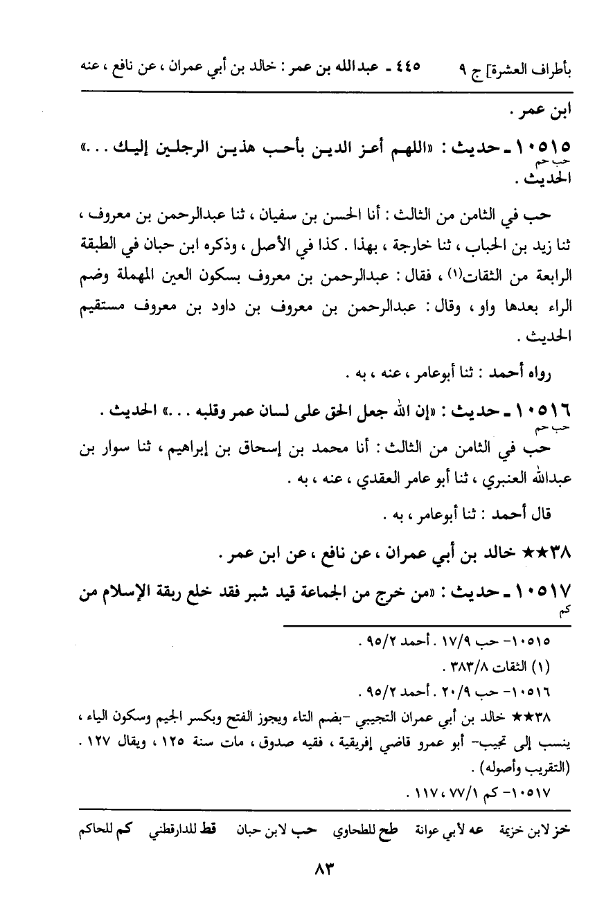10515 - حَدِيثٌ (حب حم) : " اللَّهُمَّ أَعِزَّ الدِّينَ بِأَحَبِّ هَذَيْنِ الرَّجُلَيْنِ إِلَيْكَ ... " الْحَدِيثُ. حب فِي الثَّامِنِ مِنَ الثَّالِثِ: أَنَا الْحَسَنُ بْنُ سُفْيَانَ , ثنا عَبْدُ الرَّحْمَنِ بْنُ مَعْرُوفٍ , ثنا زَيْدُ بْنُ الْحُبَابِ , ثنا خَارِجَةُ , بِهَذَا. كَذَا فِي الأَصْلِ , وَذَكَرَهُ ابْنُ حِبَّانَ فِي الطَّبَقَةِ الرَّابِعَةِ مِنَ الثِّقَاتِ , فَقَالَ: عَبْدُ الرَّحْمَنِ بْنُ مَعْرُوفٍ بِسُكُونِ الْعَيْنِ الْمُهْمَلَةِ وَضَمِّ الرَّاءِ بَعْدَهَا وَاوٌ , وَقَالَ: عَبْدُ الرَّحْمَنِ بْنُ مَعْرُوفِ بْنِ دَاوُدَ بْنِ مَعْرُوفٍ مُسْتِقيُم الْحَدِيثُ. رَوَاهُ أَحْمَدُ: ثنا أَبُو عَامِرٍ , عَنْهُ , بِهِ.