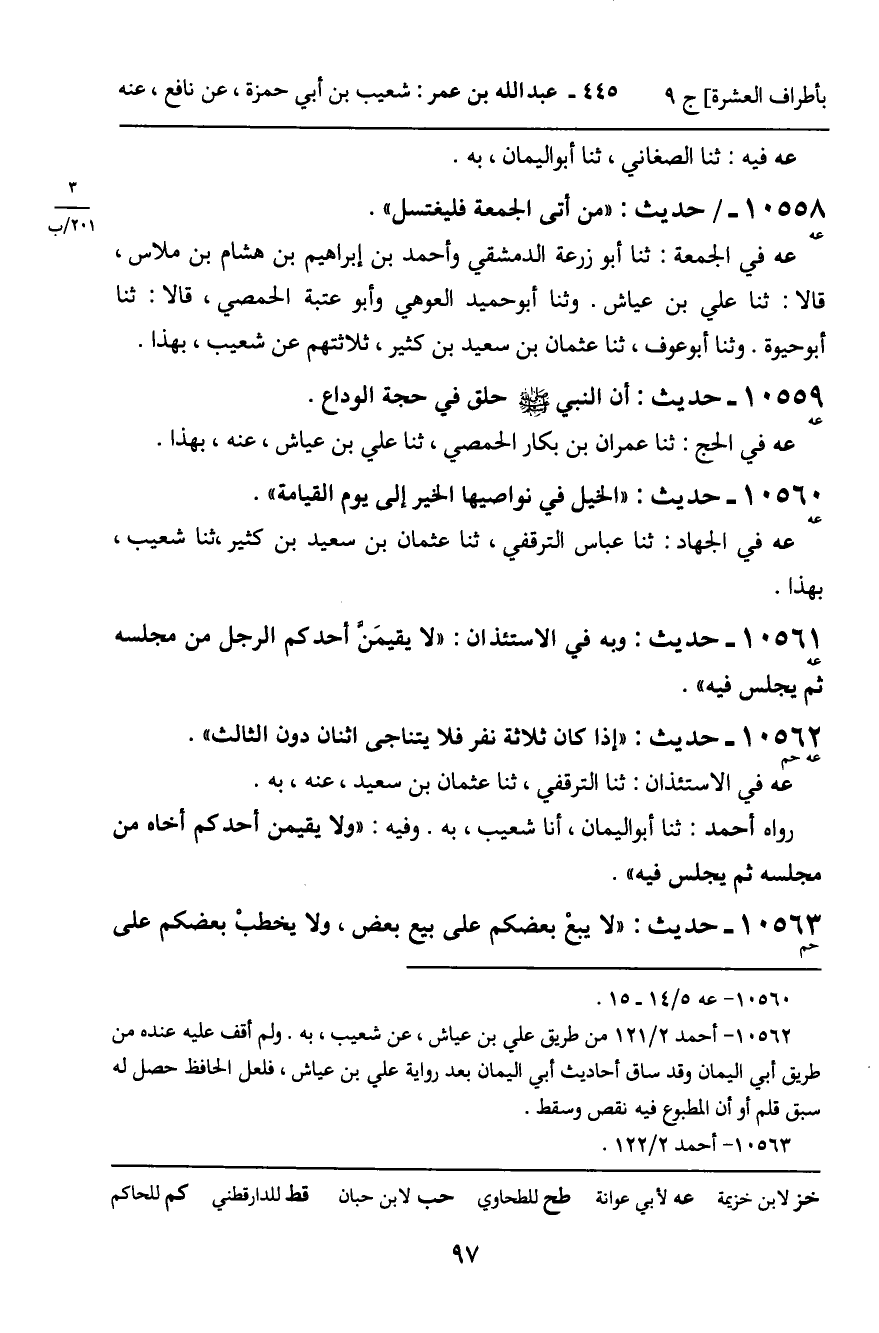 10560 - حَدِيثٌ (عه) : " الْخَيْلُ فِي نَوَاصِيهَا الْخَيْرُ إِلَى يَوْمِ الْقِيَامَة ". عِه فِي الْجِهَادِ: ثنا عَبَّاسٌ التَّرْقُفِيُّ , ثنا عُثْمَانُ بْنُ سَعِيدِ بْنِ كَثِيرٍ , ثنا شُعَيْبٌ , بِهَذَا.