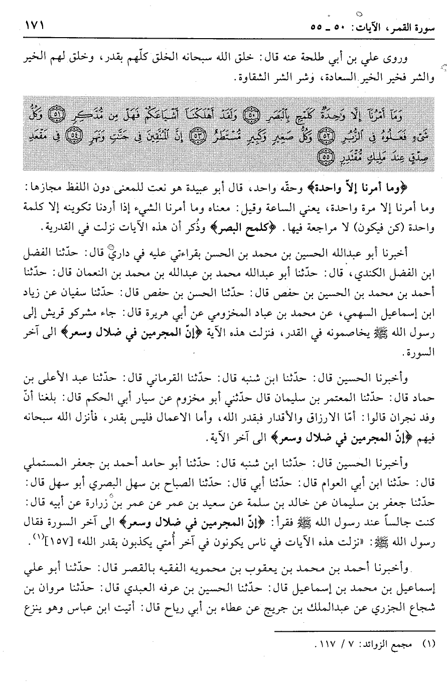 أخبرنا أبو عبد الله الحسين بن محمد بن الحسن بقراءتي عليه في داري قال: حدّثنا الفضل ابن الفضل الكندي، قال: حدّثنا أبو عبد الله محمد بن عبد الله بن محمد بن النعمان قال: حدّثنا أحمد بن محمد بن الحسين بن حفص قال: حدّثنا الحسن بن حفص قال: حدّثنا سفيان عن زياد ابن إسماعيل السهمي، عن محمد بن عباد المخزومي عن أبي هريرة قال: جاء مشركو قريش إلى رسول الله صلّى الله عليه وسلّم يخاصمونه في القدر، فنزلت هذه الآية إِنَّ الْمُجْرِمِينَ فِي ضَلالٍ وَسُعُرٍ الى آخر السورة.