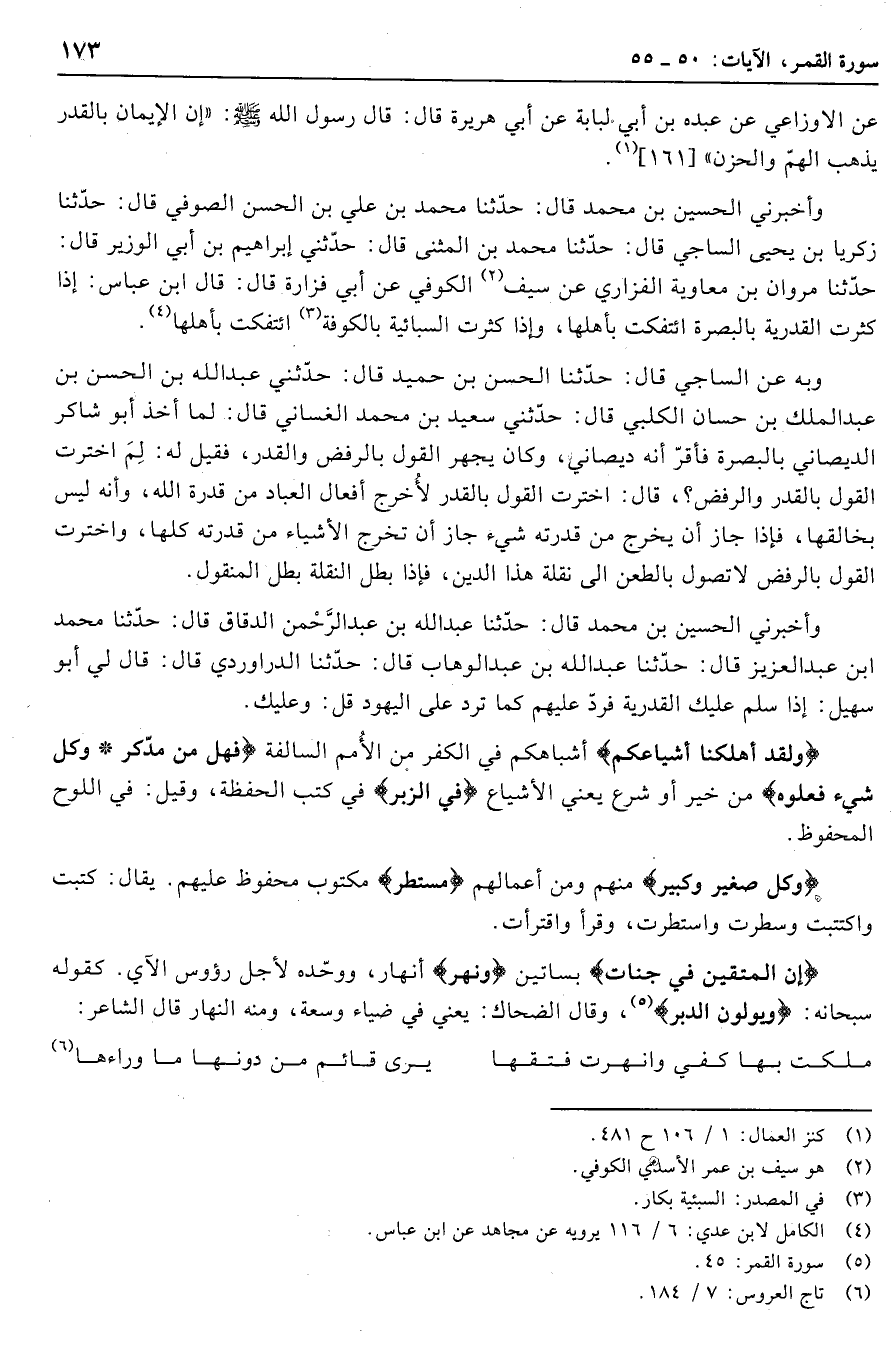 حدّثنا مروان بن معاوية الفزاري عن سيف «2» الكوفي عن أبي فزارة قال: قال ابن عباس: إذا كثرت القدرية بالبصرة ائتفكت بأهلها، وإذا كثرت السبائية بالكوفة «3» ائتفكت بأهلها «4» .