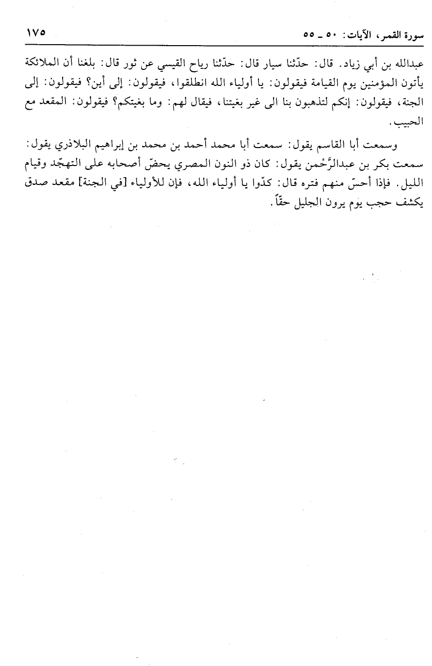 عبد الله بن أبي زياد. قال: حدّثنا سيار قال: حدّثنا رياح القيسي عن ثور قال: بلغنا أن الملائكة يأتون المؤمنين يوم القيامة فيقولون: يا أولياء الله انطلقوا، فيقولون: إلى أين؟ فيقولون: إلى الجنة، فيقولون: إنكم لتذهبون بنا الى غير بغيتنا، فيقال لهم: وما بغيتكم؟ فيقولون: المقعد مع الحبيب.