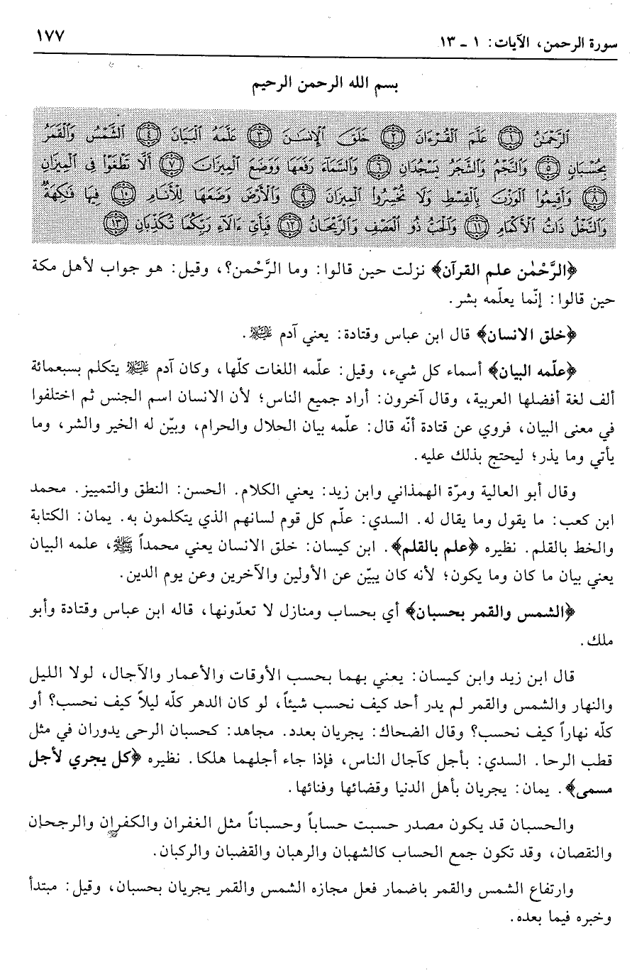 الشَّمْسُ وَالْقَمَرُ بِحُسْبانٍ (5) وَالنَّجْمُ وَالشَّجَرُ يَسْجُدانِ (6) وَالسَّماءَ رَفَعَها وَوَضَعَ الْمِيزانَ (7) أَلاَّ تَطْغَوْا فِي الْمِيزانِ (8) وَأَقِيمُوا الْوَزْنَ بِالْقِسْطِ وَلا تُخْسِرُوا الْمِيزانَ (9)