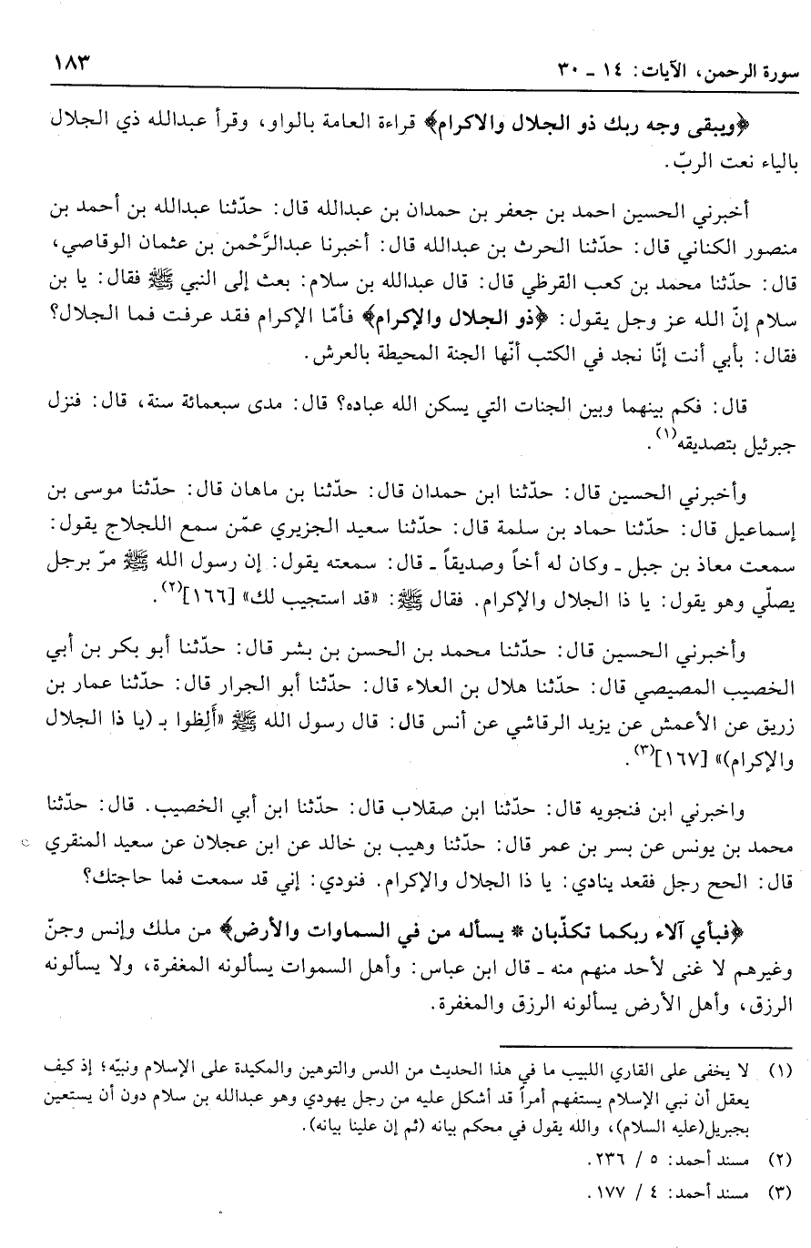 أخبرني الحسين احمد بن جعفر بن حمدان بن عبد الله قال: حدّثنا عبد الله بن أحمد بن منصور الكناني قال: حدّثنا الحرث بن عبد الله قال: أخبرنا عبد الرّحمن بن عثمان الوقاصي، قال: حدّثنا محمد بن كعب القرظي قال: قال عبد الله بن سلام: بعث إلي النبي صلّى الله عليه وسلّم فقال: يا بن سلام إنّ الله عز وجل يقول: ذُو الْجَلالِ وَالْإِكْرامِ فأمّا الإكرام فقد عرفت فما الجلال؟