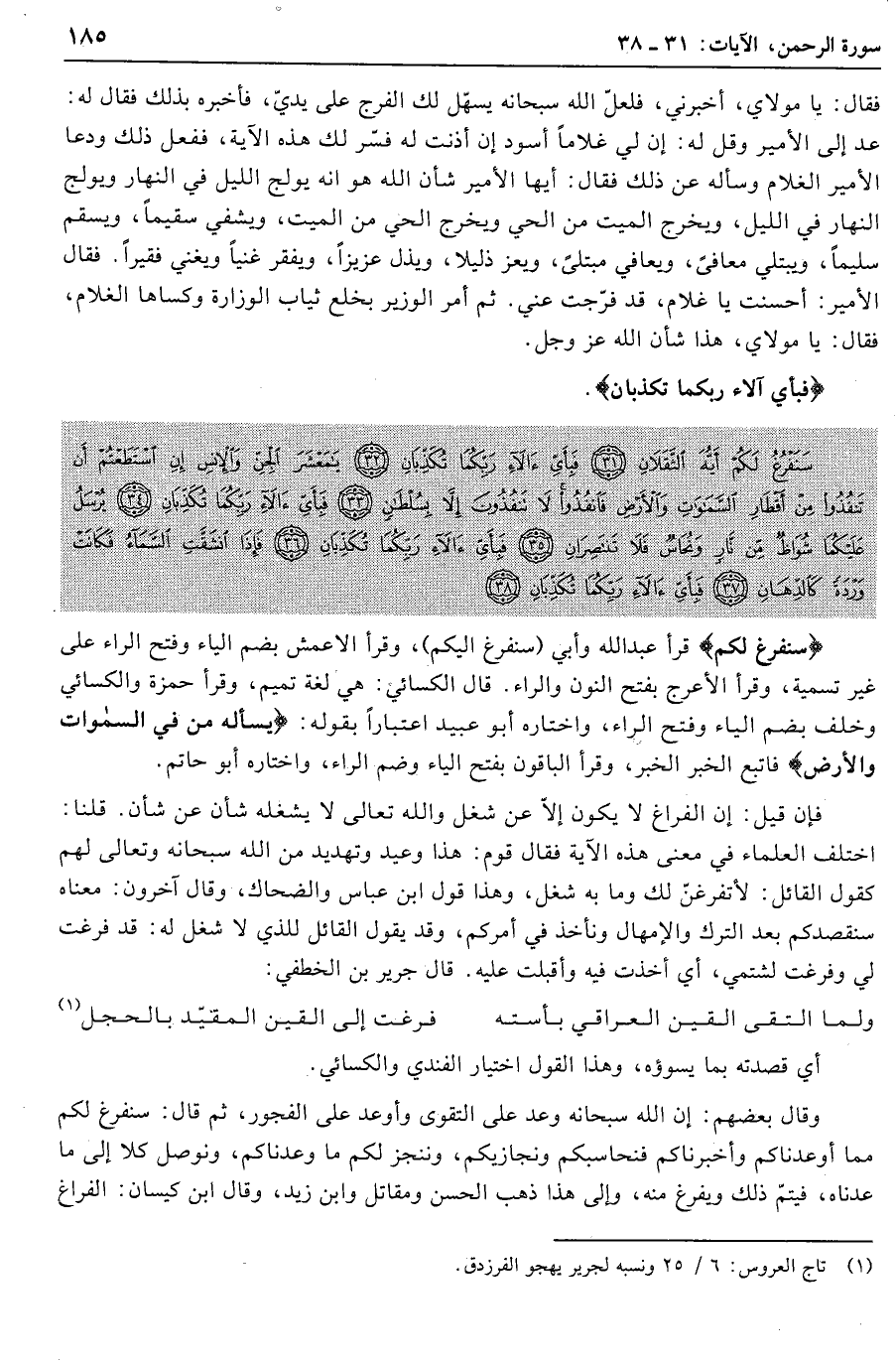 سَنَفْرُغُ لَكُمْ أَيُّهَ الثَّقَلانِ (31) فَبِأَيِّ آلاءِ رَبِّكُما تُكَذِّبانِ (32) يا مَعْشَرَ الْجِنِّ وَالْإِنْسِ إِنِ اسْتَطَعْتُمْ أَنْ تَنْفُذُوا مِنْ أَقْطارِ السَّماواتِ وَالْأَرْضِ فَانْفُذُوا لا تَنْفُذُونَ إِلاَّ بِسُلْطانٍ (33) فَبِأَيِّ آلاءِ رَبِّكُما تُكَذِّبانِ (34) يُرْسَلُ عَلَيْكُما شُواظٌ مِنْ نارٍ وَنُحاسٌ فَلا تَنْتَصِرانِ (35)