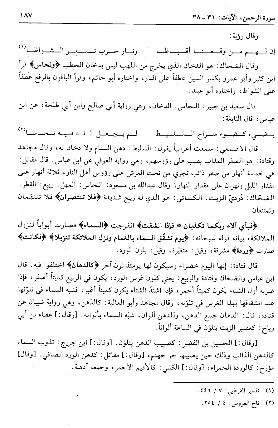 قال قتادة: إنها اليوم خضراء وسيكون لها يومئذ لون آخر كَالدِّهانِ اختلفوا فيه. قال ابن عباس والضحاك وقتادة والربيع: يعني كلون غرس الورد، يكون في الربيع كميتا أصفر، فإذا ضربه أول الشتاء يكون كميتا أحمر، فإذا اشتدّ الشتاء يكون كميتا أغبر، فشبه السماء في تلوّنها عند انشقاقها بهذا الغرس في تلوّنه، وقال مجاهد وأبو العالية: كالدّهن، وهي رواية شيبان عن قتادة، قال: الدهان جمع الدهن، وللدهن ألوان، شبّه السماء بألوانه. [وقال:] عطاء بن أبي رياح: كعصير الزيت يتلوّن في الساعة ألوانا.