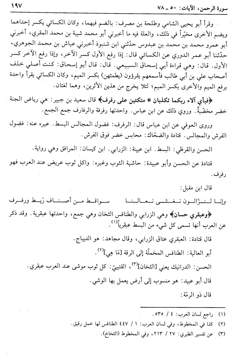وروى العوفي عن ابن عباس قال: الرفرف: فضول المجالس البسط. عيره عنه: فضول الفرش والمجالس. قتادة والضحّاك: محابس خضر فوق الفرش.