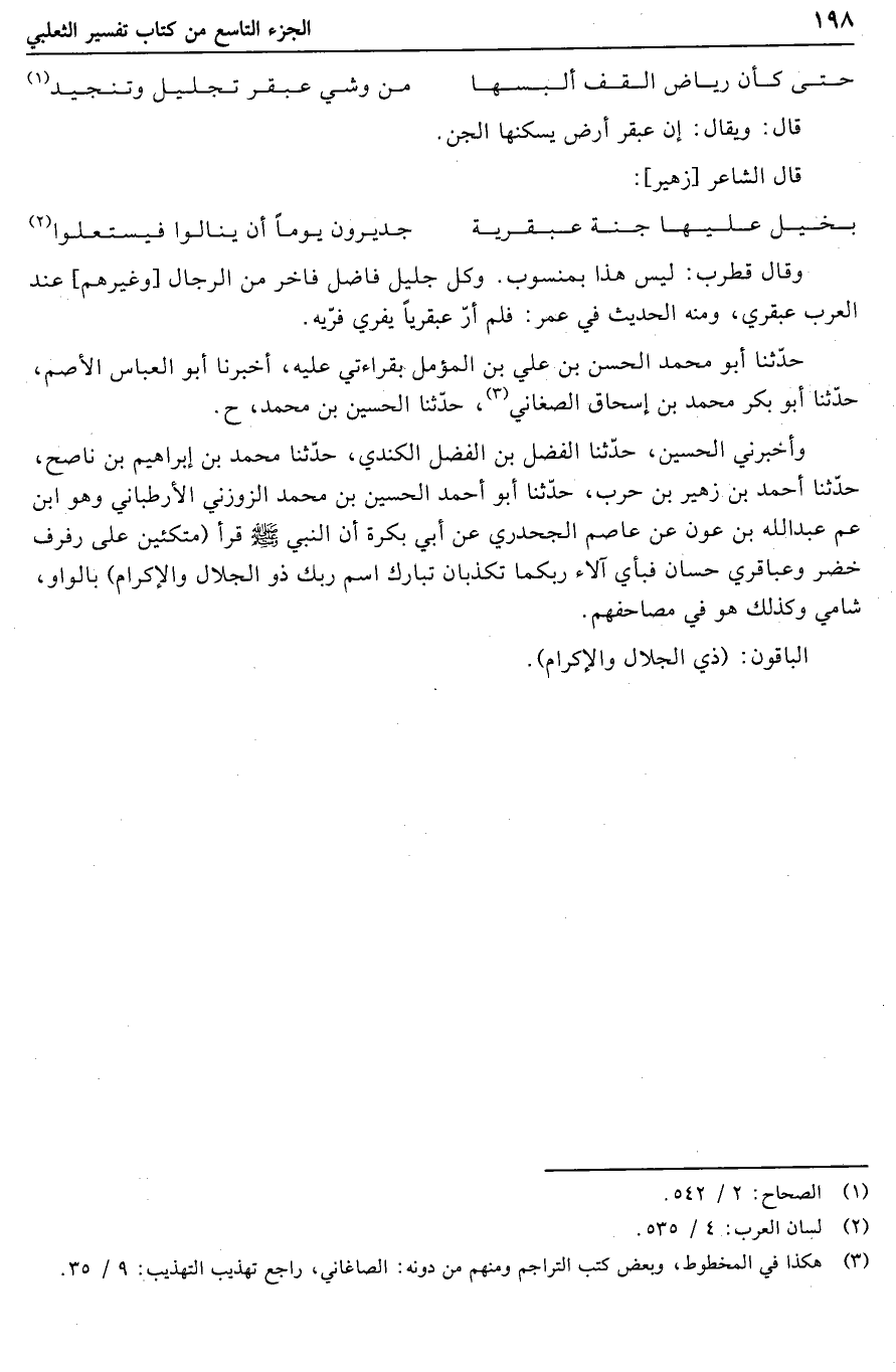 وأخبرني الحسين، حدّثنا الفضل بن الفضل الكندي، حدّثنا محمد بن إبراهيم بن ناصح، حدّثنا أحمد بن زهير بن حرب، حدّثنا أبو أحمد الحسين بن محمد الزوزني الأرطباني وهو ابن عم عبد الله بن عون عن عاصم الجحدري عن أبي بكرة أن النبي صلّى الله عليه وسلّم قرأ (متكئين على رفرف خضر وعباقري حسان فَبِأَيِّ آلاءِ رَبِّكُما تُكَذِّبانِ تبارك اسم ربك ذو الجلال والإكرام) بالواو، شامي وكذلك هو في مصاحفهم.