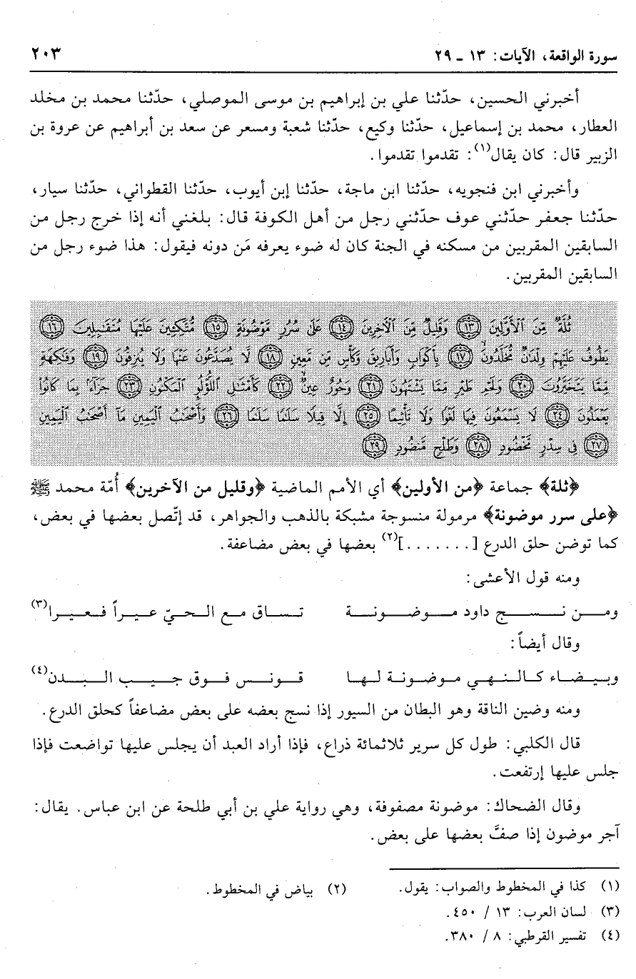 ثُلَّةٌ جماعة مِنَ الْأَوَّلِينَ أي الأمم الماضية وَقَلِيلٌ مِنَ الْآخِرِينَ أمّة محمد صلّى الله عليه وسلّم عَلى سُرُرٍ مَوْضُونَةٍ مرمولة منسوجة مشبكة بالذهب والجواهر، قد اتّصل بعضها في بعض، كما توضن حلق الدرع [......] «2» بعضها في بعض مضاعفة.