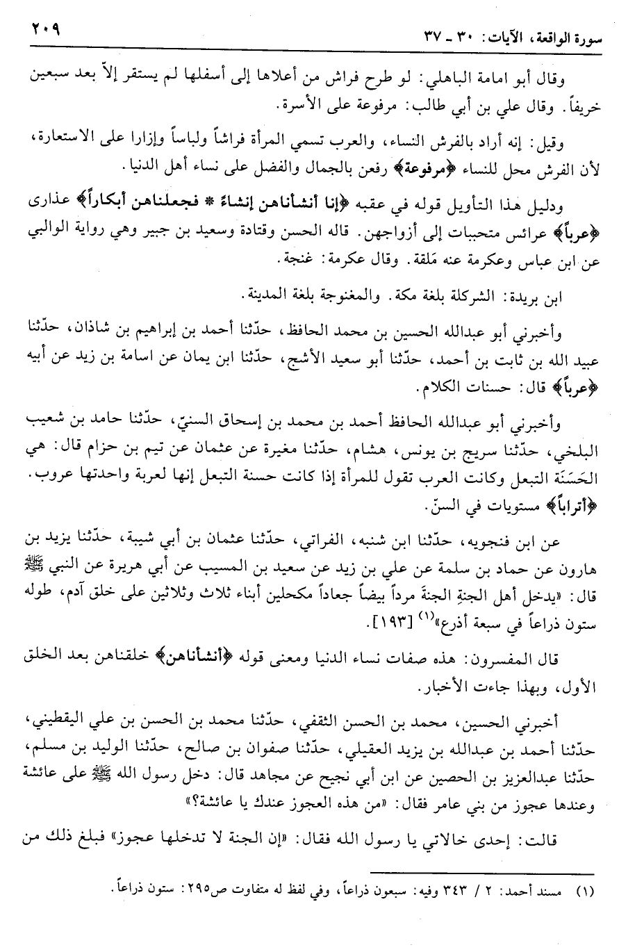 ودليل هذا التأويل قوله في عقبه إِنَّا أَنْشَأْناهُنَّ إِنْشاءً فَجَعَلْناهُنَّ أَبْكاراً عذارى عُرُباً عرائس متحببات إلى أزواجهن. قاله الحسن وقتادة وسعيد بن جبير وهي رواية الوالبي عن ابن عباس وعكرمة عنه ملقة. وقال عكرمة: غنجة.