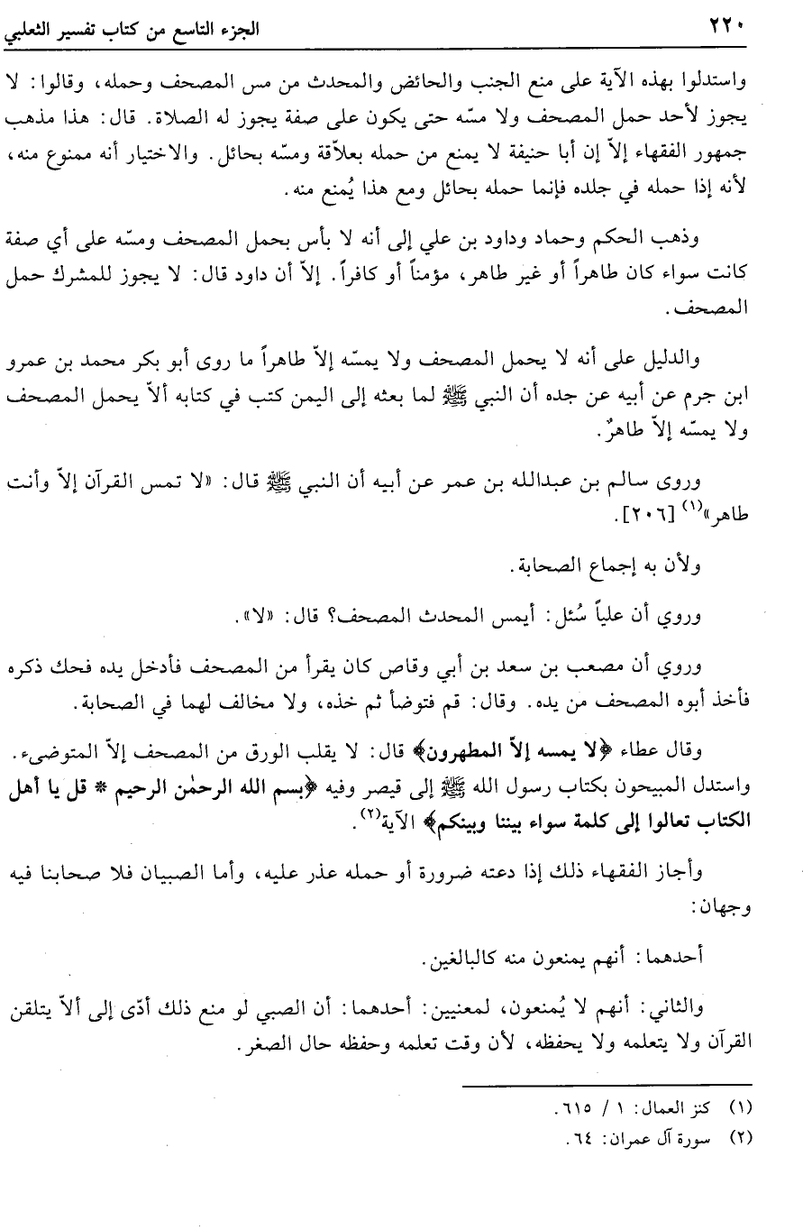 وروى سالم بن عبد الله بن عمر عن أبيه أن النبي صلّى الله عليه وسلّم قال: «لا تمس القرآن إلّا وأنت طاهر» «1» [206] .