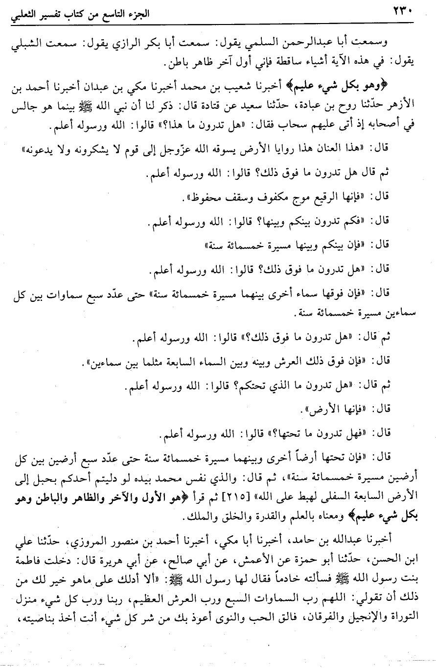 قال: «فإن تحتها أرضا أخرى وبينهما مسيرة خمسمائة سنة حتى عدّد سبع أرضين بين كل أرضين مسيرة خمسمائة سنة» ، ثم قال: والذي نفس محمد بيده لو دليتم أحدكم بحبل إلى الأرض السابعة السفلى لهبط على الله» [215] ثم قرأ هُوَ الْأَوَّلُ وَالْآخِرُ وَالظَّاهِرُ وَالْباطِنُ وَهُوَ بِكُلِّ شَيْءٍ عَلِيمٌ ومعناه بالعلم والقدرة والخلق والملك.